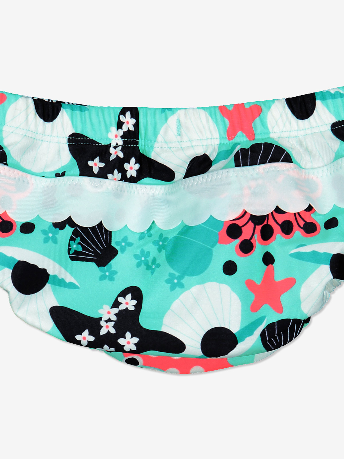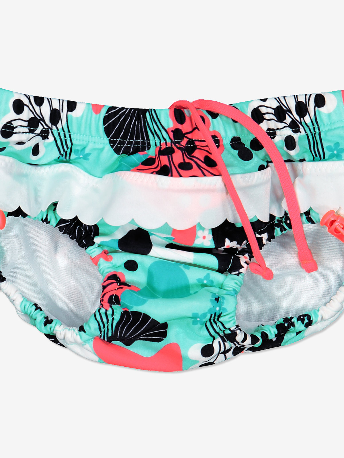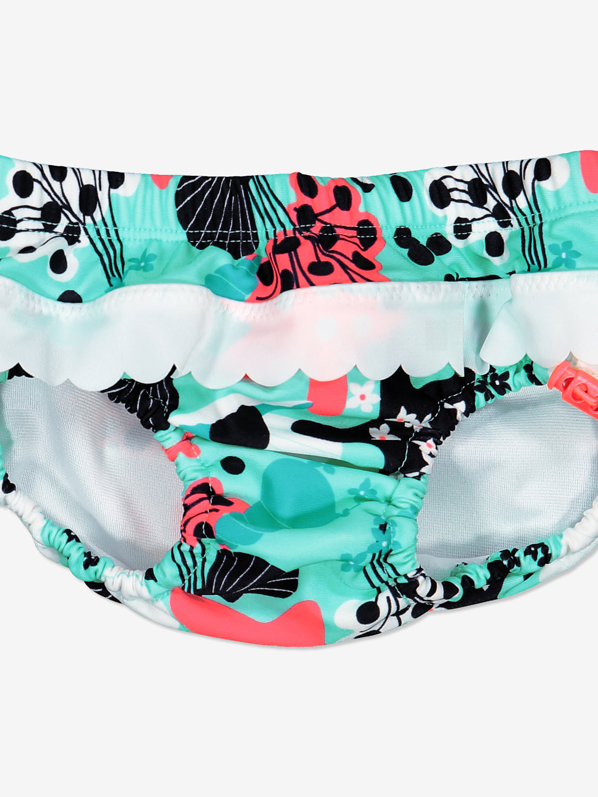Mönstrad bikinitrosa i ett återvunnet tyg för baby med UV-skydd. UPF 50 (Ultraviolet Protection Factor) innebär ett 98 procentigt skydd mot de farliga UV-strålarna. Trosan har dubbla volanger och resor i midja, midjan går även att regleras från insidan med knytband. Trosan passar även perfekt för babysim då det finns ett extra foder som fångar upp små olyckor.