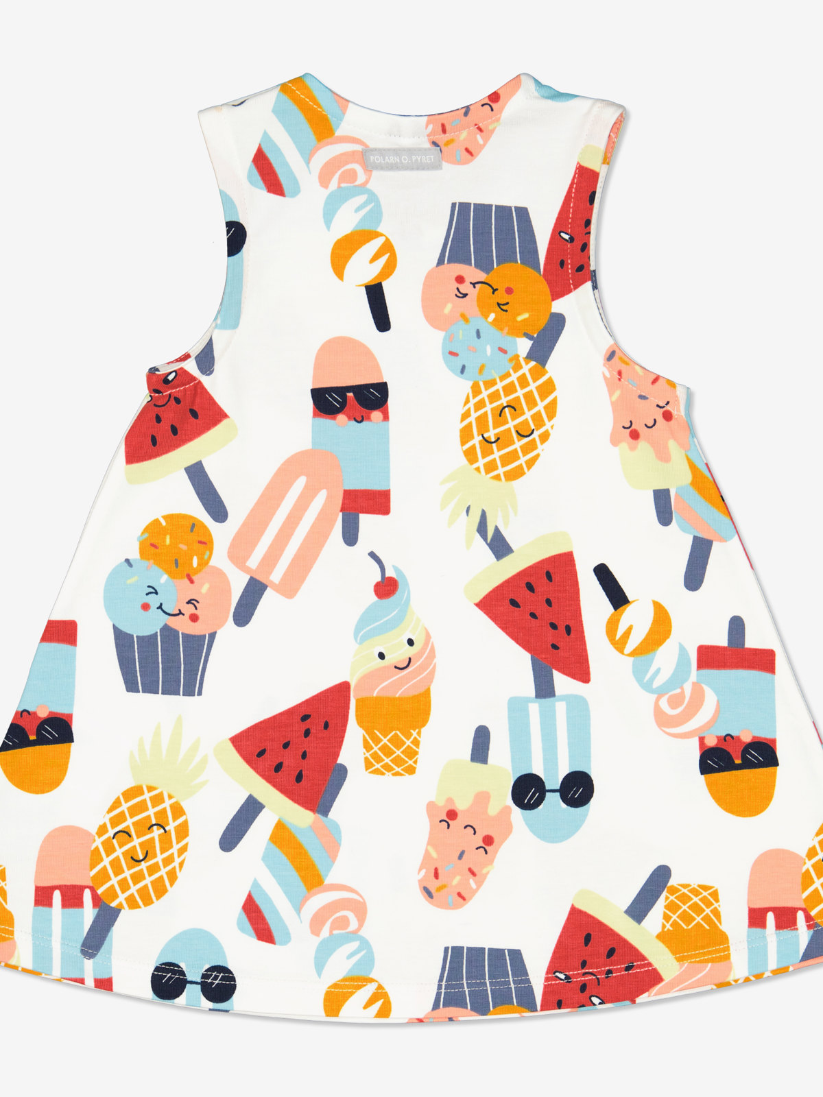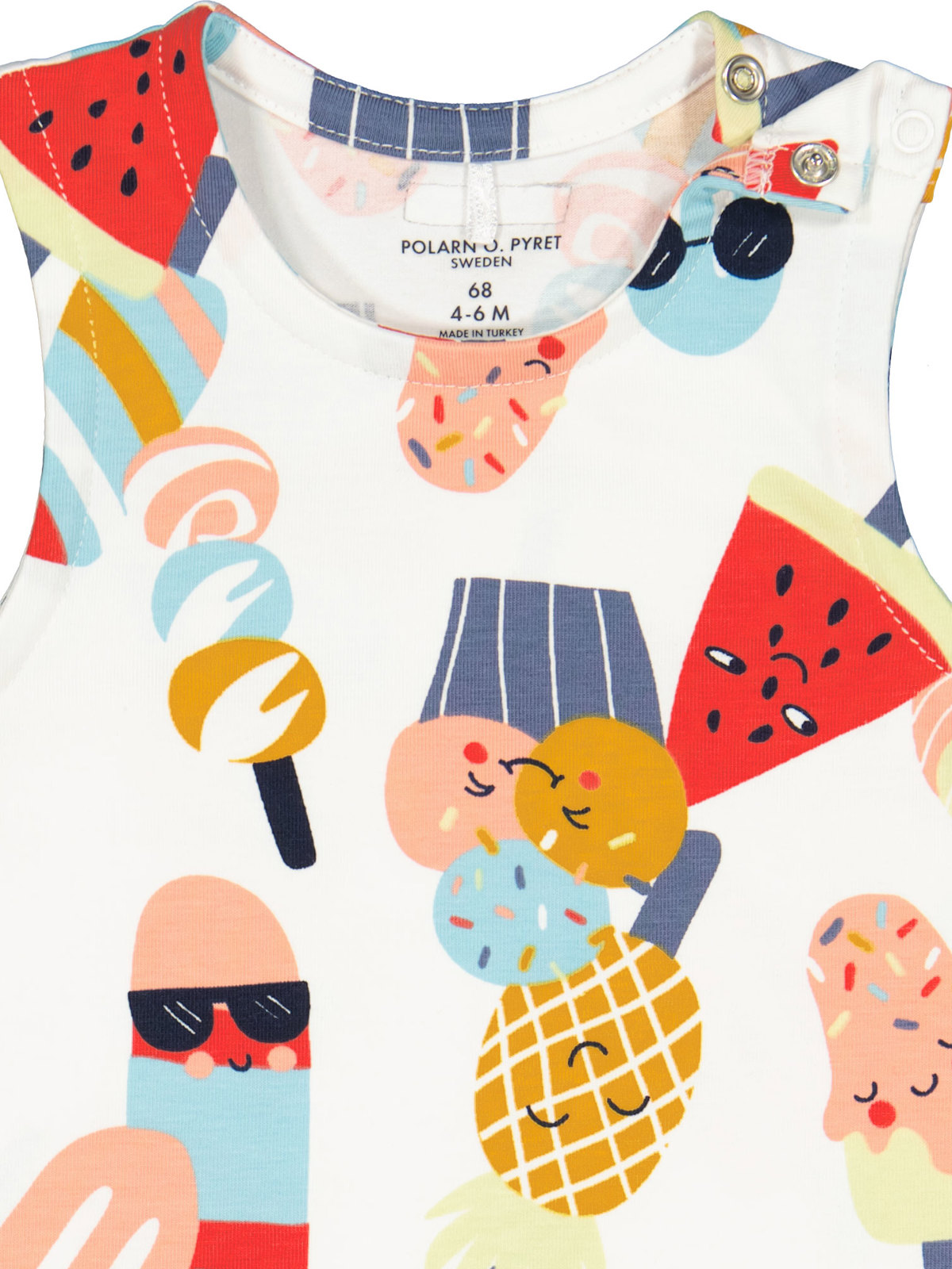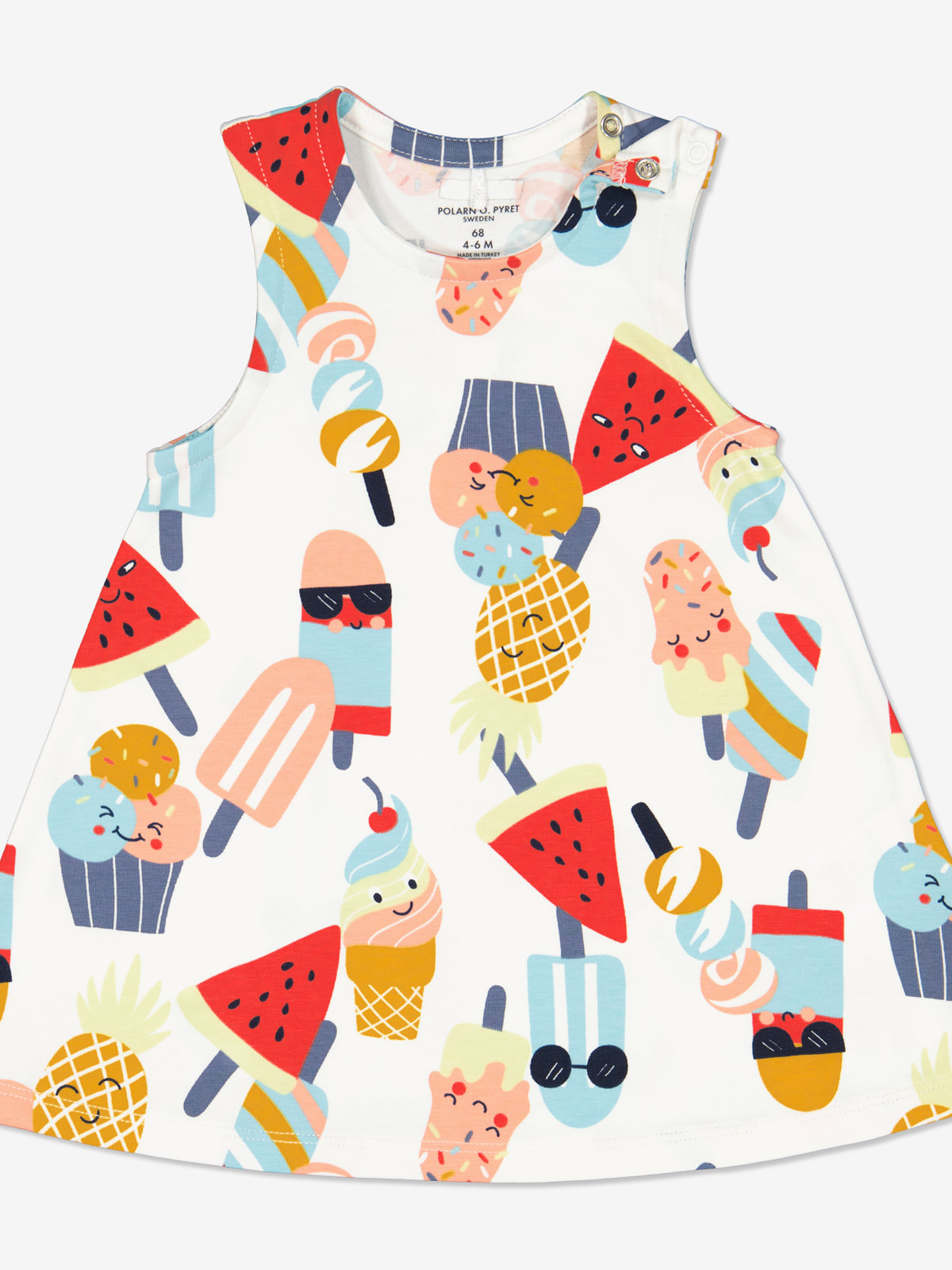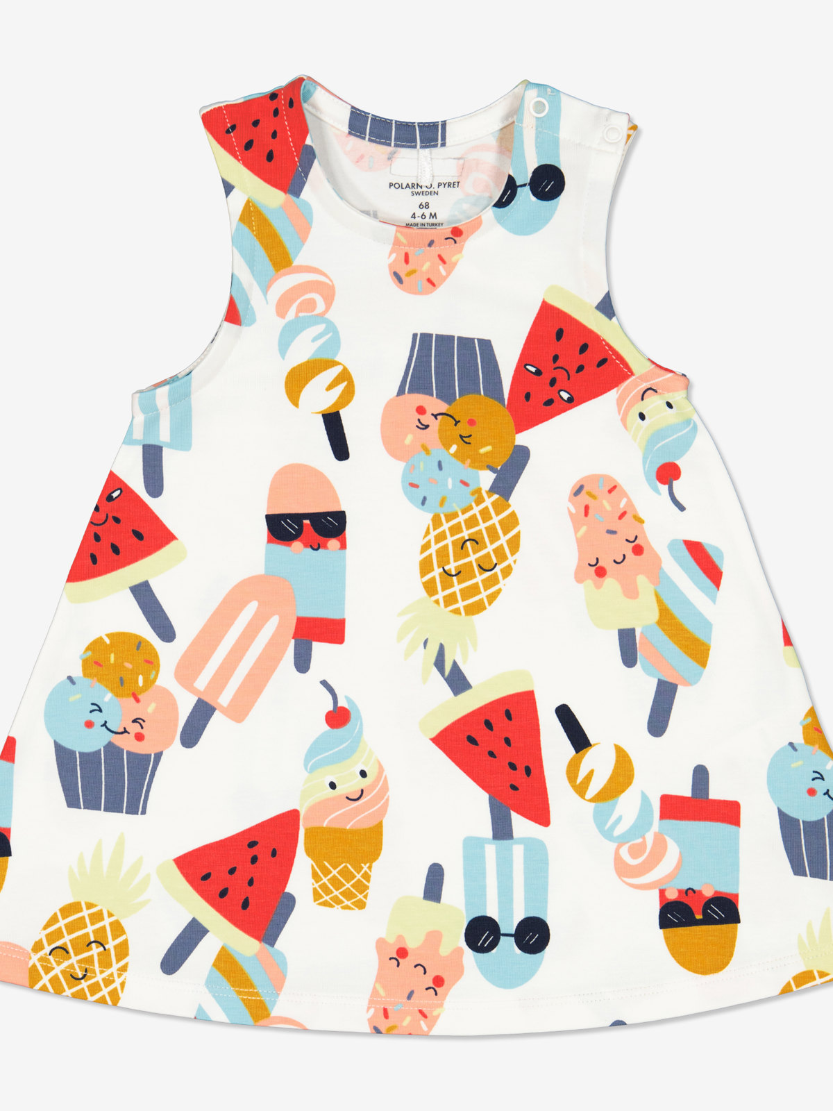 En bedårande klänning för de allra minsta i mjuk ekologisk bomull. Klänningen är helmönstrad med ett härligt glasstryck och passar perfekt till vardags eller till festilga tillfällen! Tryckknapparna på ena axeln underlättar klädbyten. Storlek 50-62 har tryckknappar på båda axlarna.