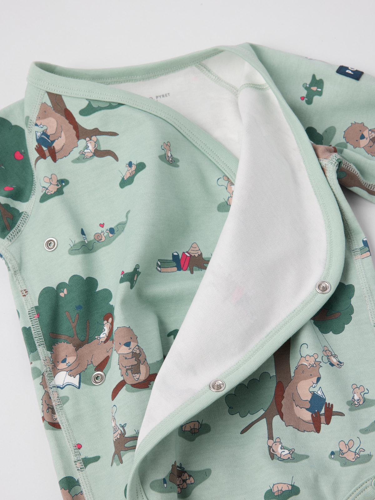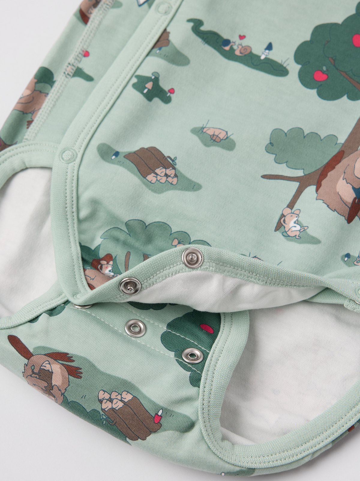 Förlängningsbar omlottbody i 100 % ekologisk bomull. Tack vare den smarta lösningen med en extra rad tryckknappar i grenen och nedvikbar mudd vid ärmsluten kan bodyn växa tillsammans med bebisen!