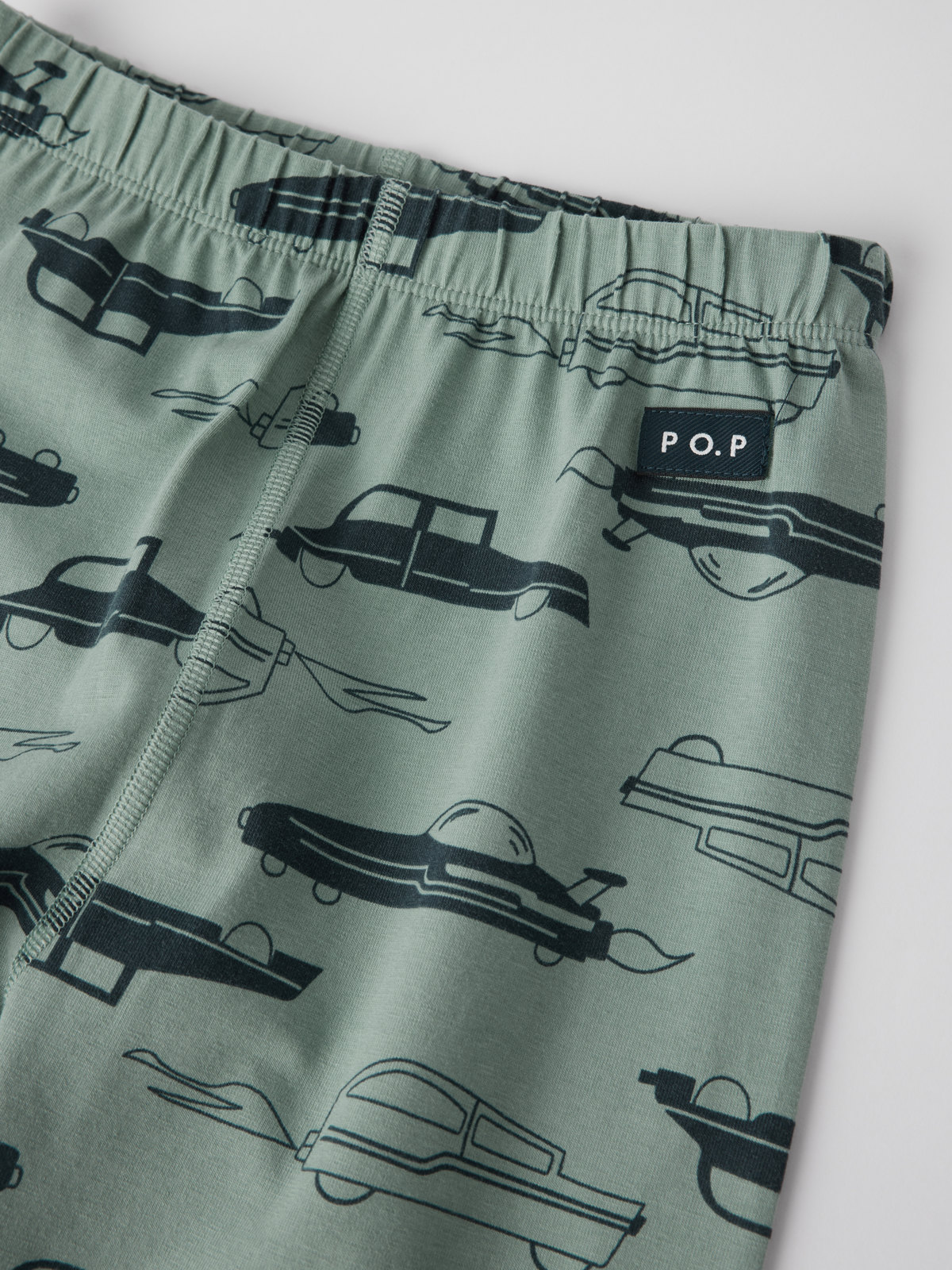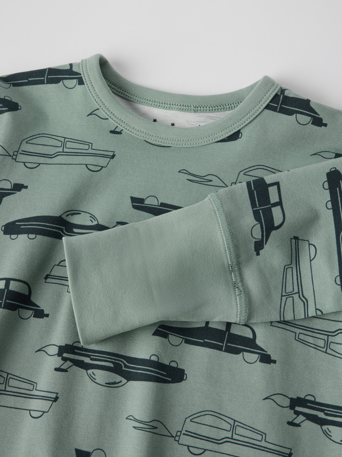 Tvådelad pyjamas i mjuk ekologisk bomull. Tröjan har extra lång mudd vid ärmslut som går att vika upp eller ned. Byxan har elastisk midja och extra lång mudd vid benslut.