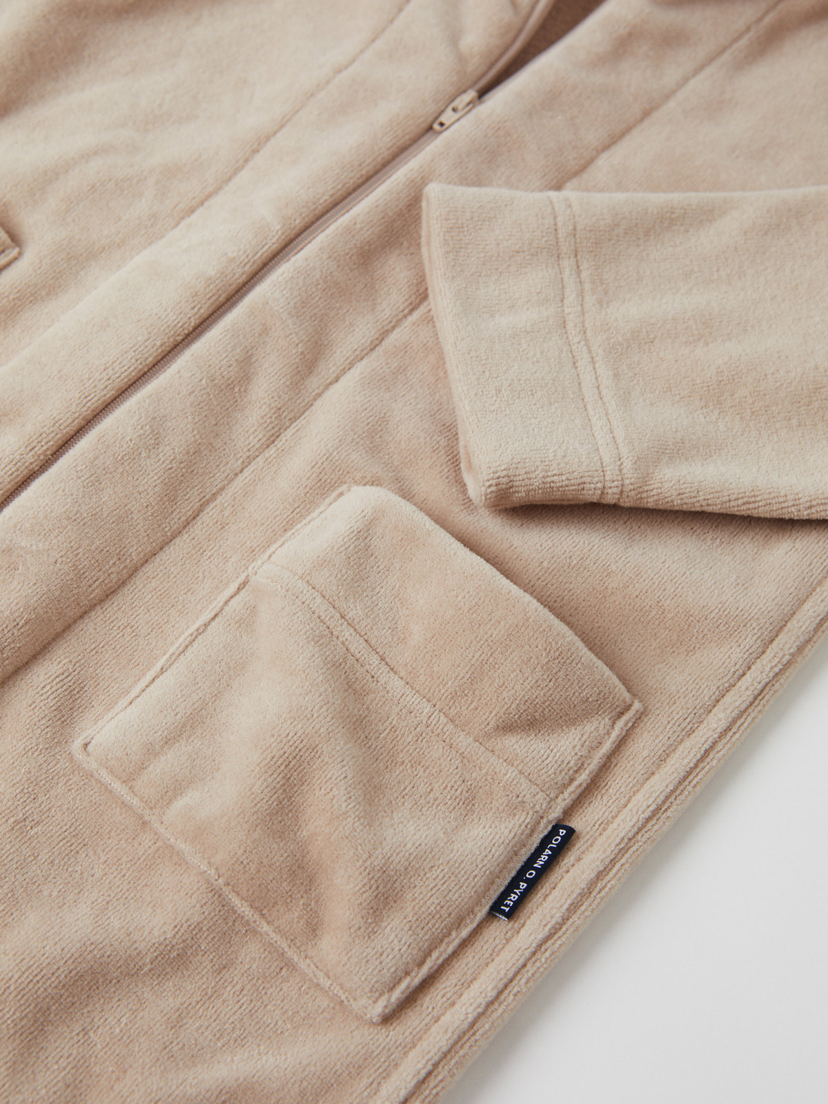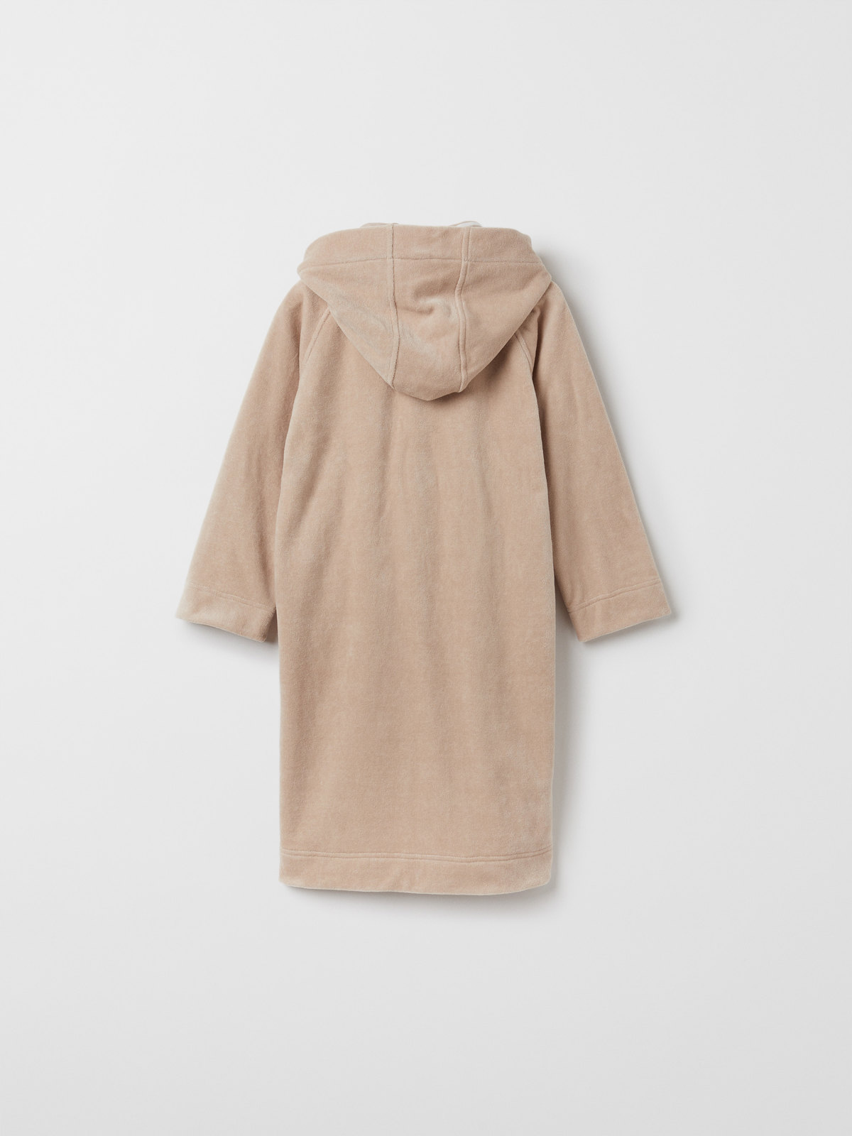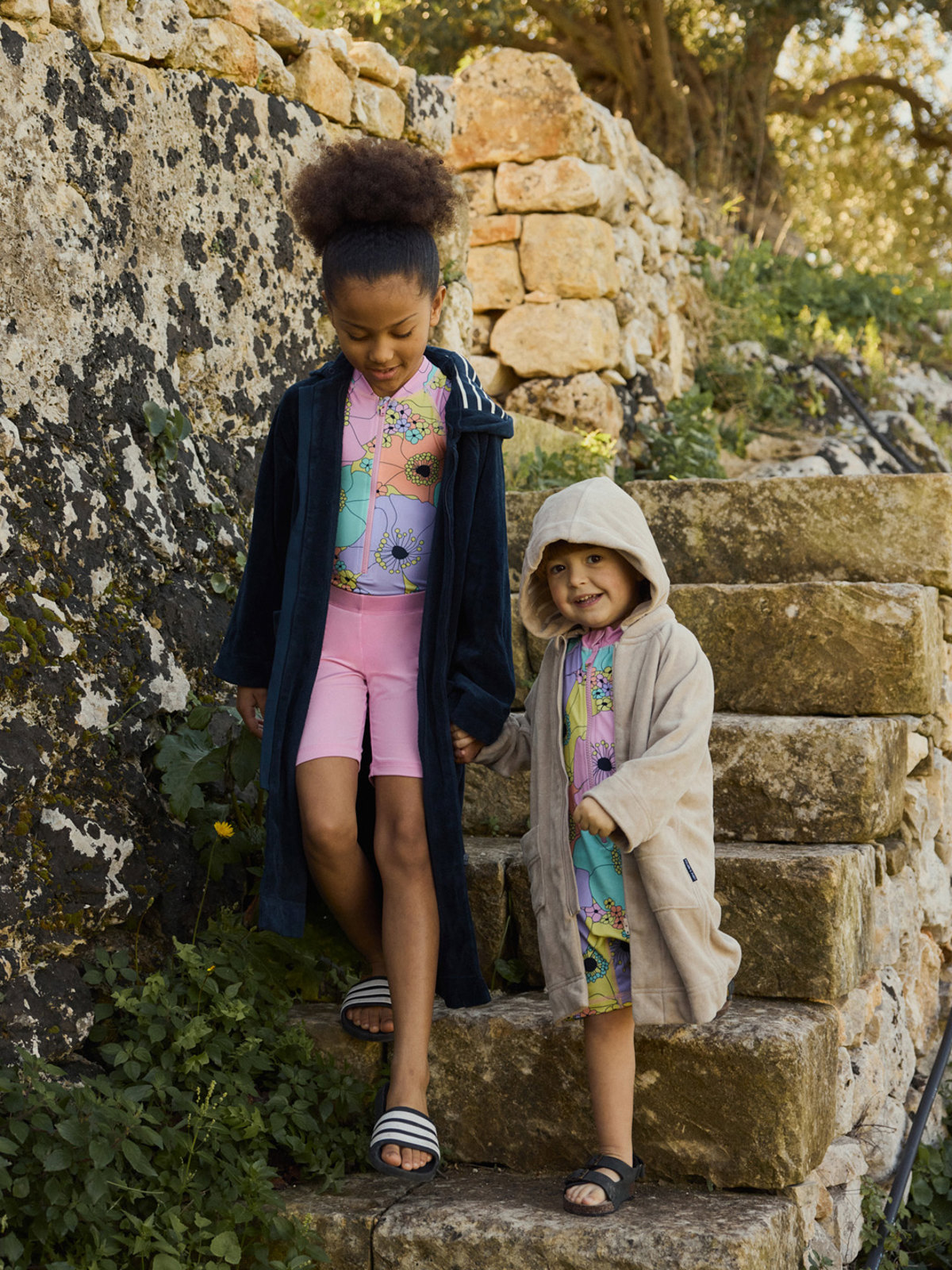 Badrocken är tillverkad i både mjuk ekologisk bomull och återvunnen polyester. Den har avtagbar huva som går att fästas med tryckknappar och ett mjukt bomullsfoder i vår klassiska rand. Badrocken slutar mitt på vaden och har två fickor fram och stängs med dragkedja.
