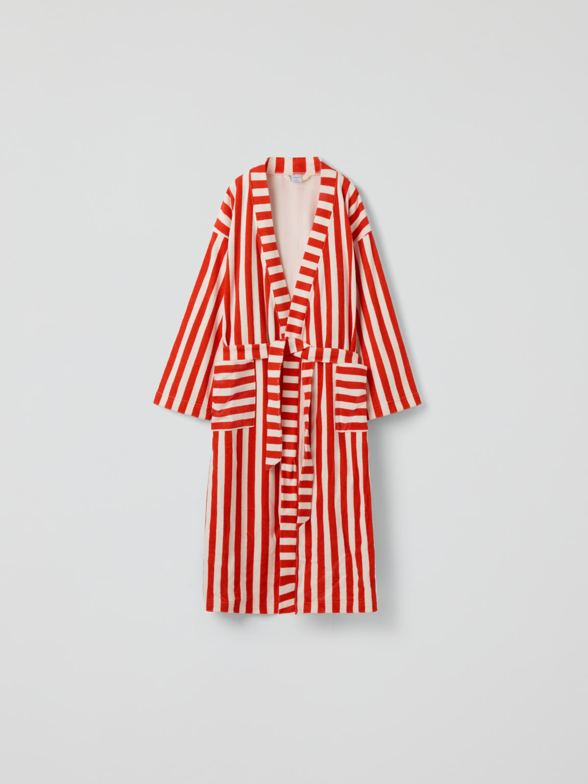 Randig badrock i mjukt och skönt material av ekologisk bomull och återvunnen polyester för vuxen. Badrocken har två stora fickor och stängs med knytband.
