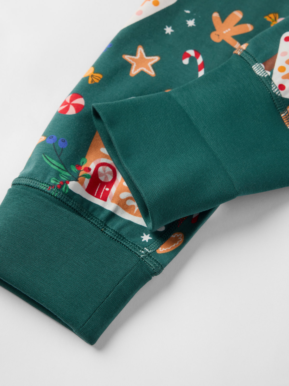 Tvådelad pyjamas i mjuk ekologisk bomull. Tröjan har extra lång mudd vid ärmslut som går att vika upp eller ned. Byxan har elastisk midja och extra lång mudd vid benslut.