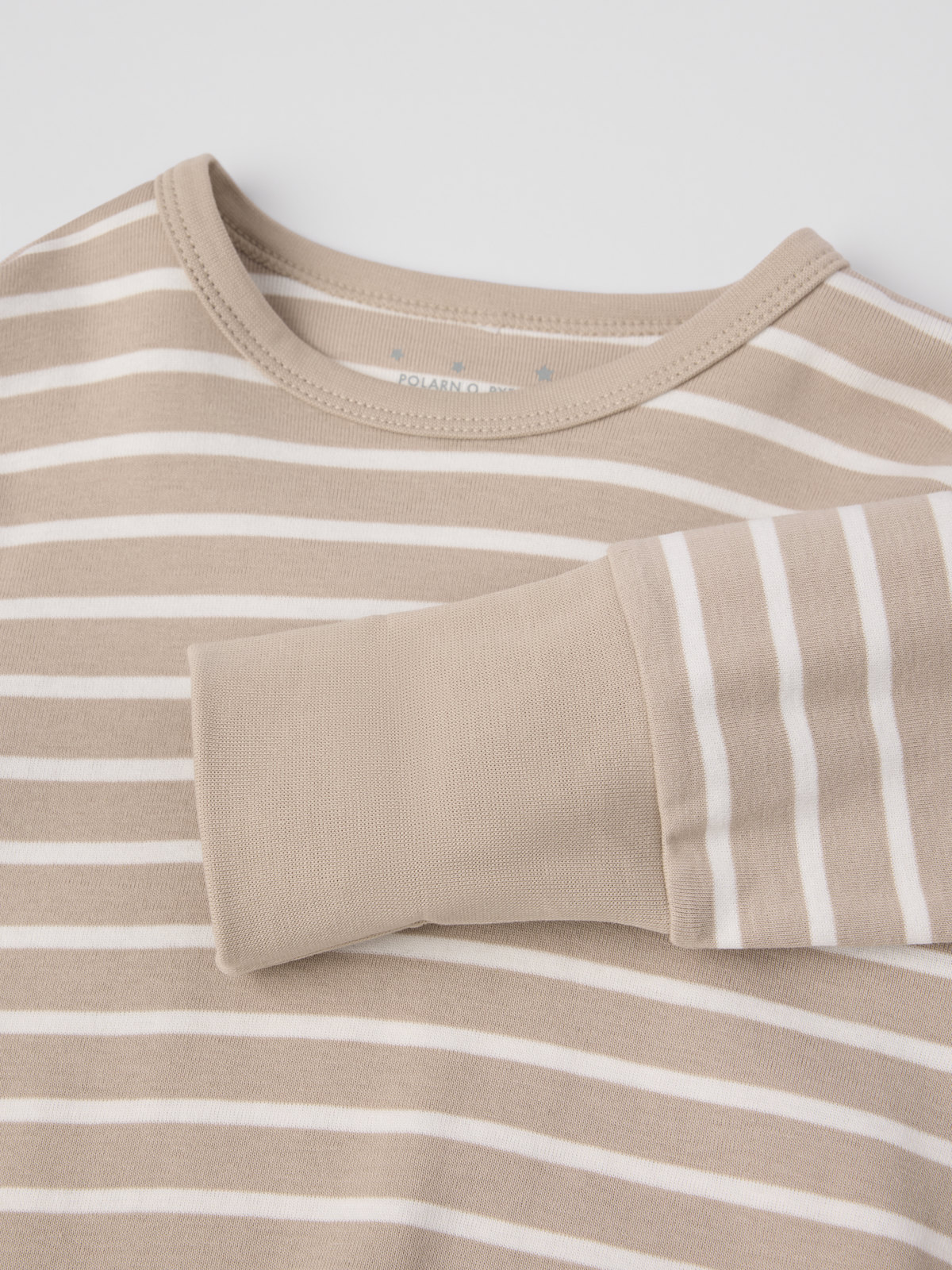 Tvådelad pyjamas i mjuk, ekologisk bomull med vår klassiska rand. Tröjan har extra lång mudd vid ärmslut som går att vika upp eller ned. Byxan har elastisk midja och extra lång mudd vid benslut.