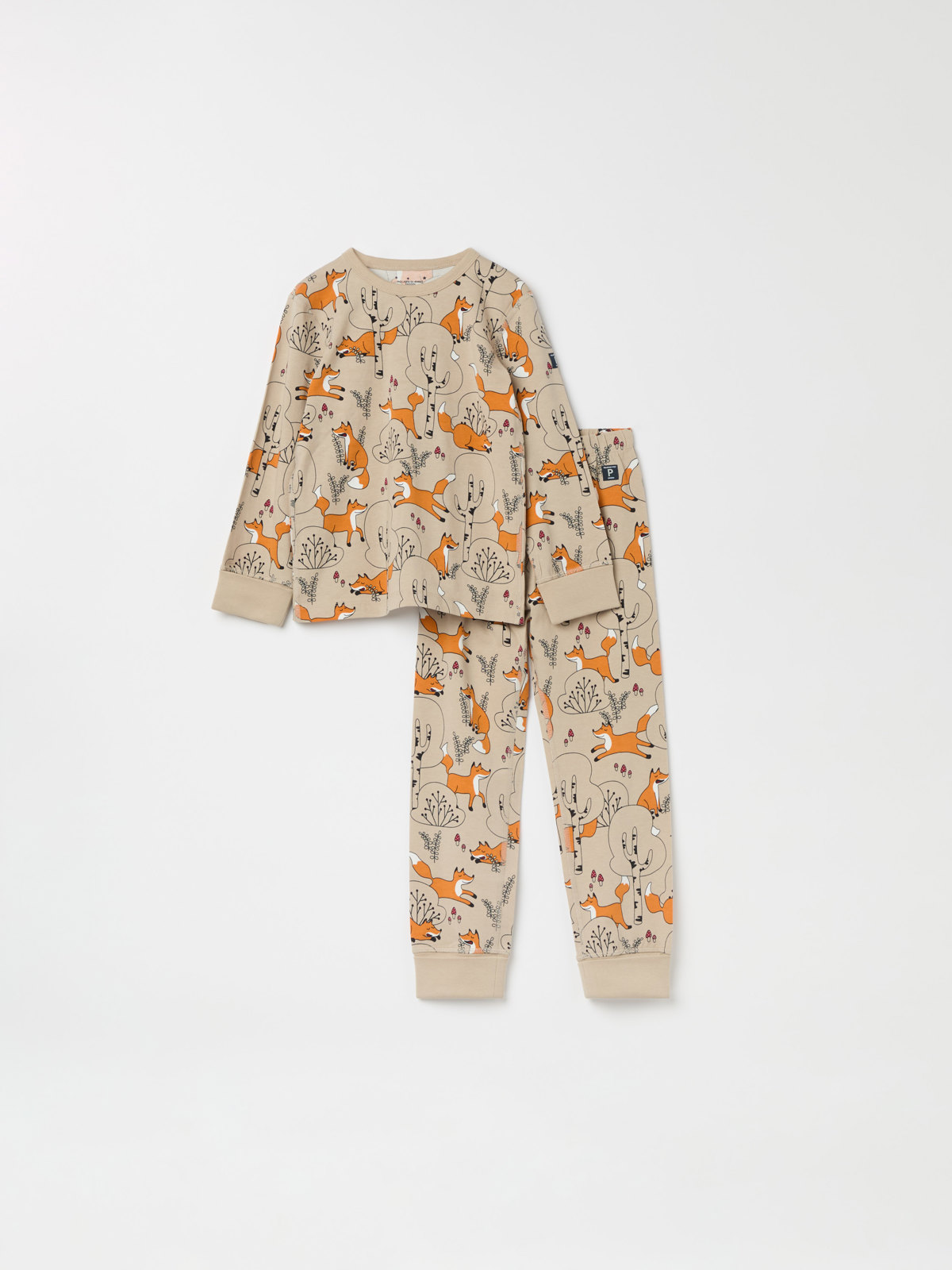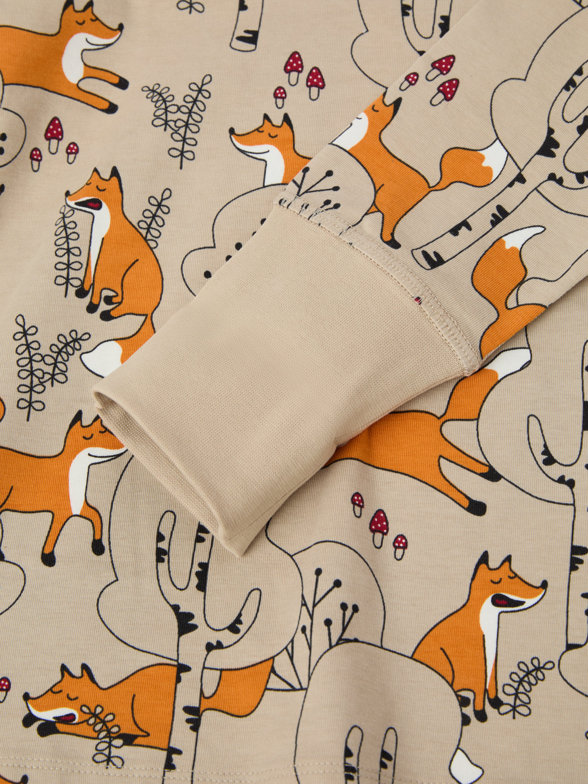 Tvådelad pyjamas i mjuk ekologisk bomull, helmönstrad med rävar. Tröjan har extra lång mudd vid ärmslut som går att vika upp eller ned. Byxan har elastisk midja och extra lång mudd vid benslut.