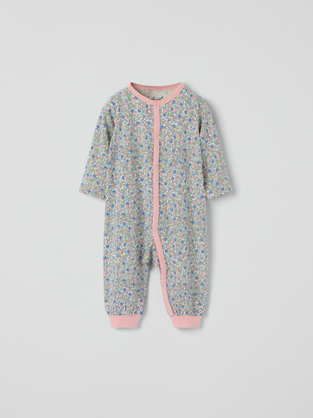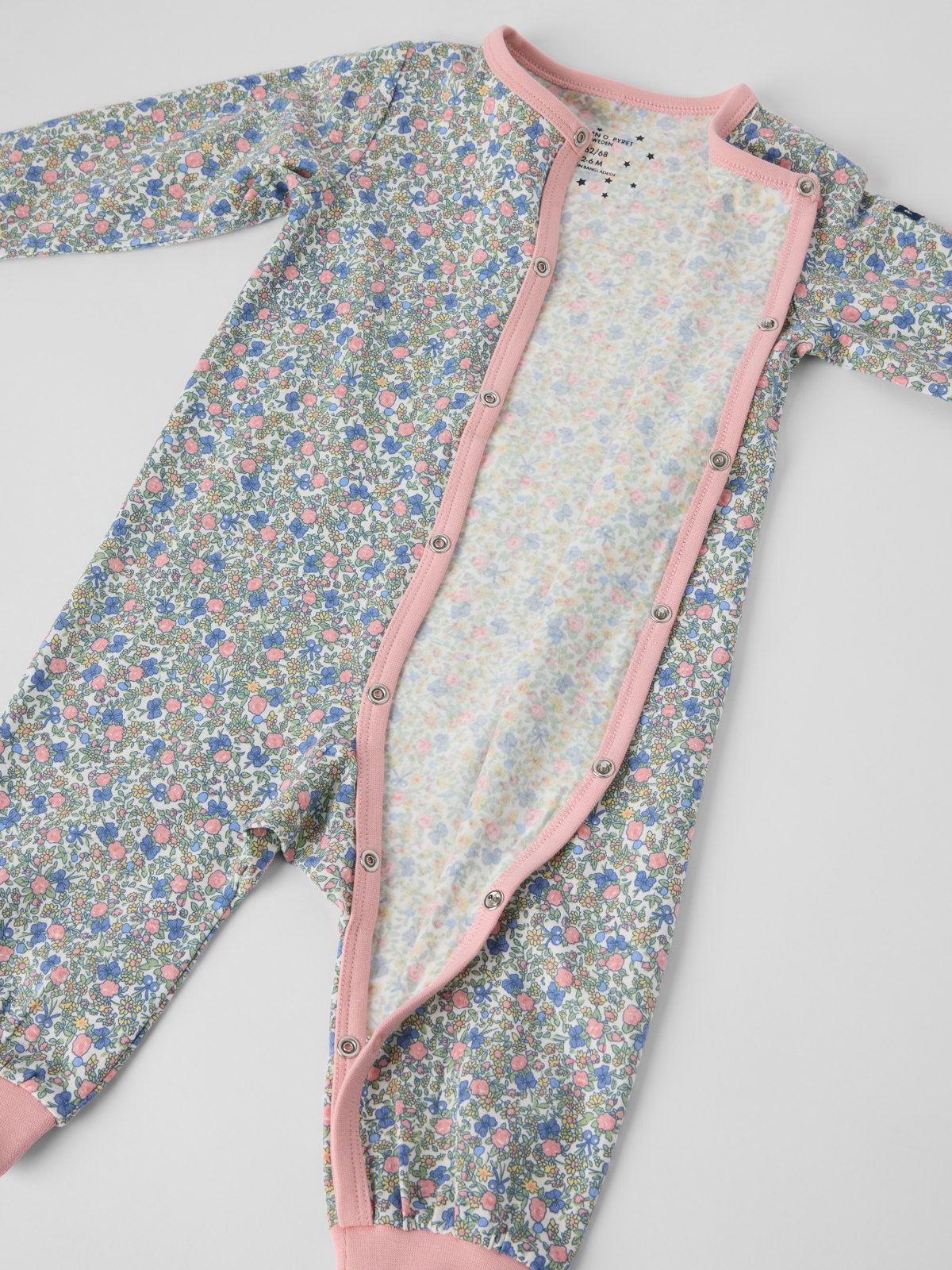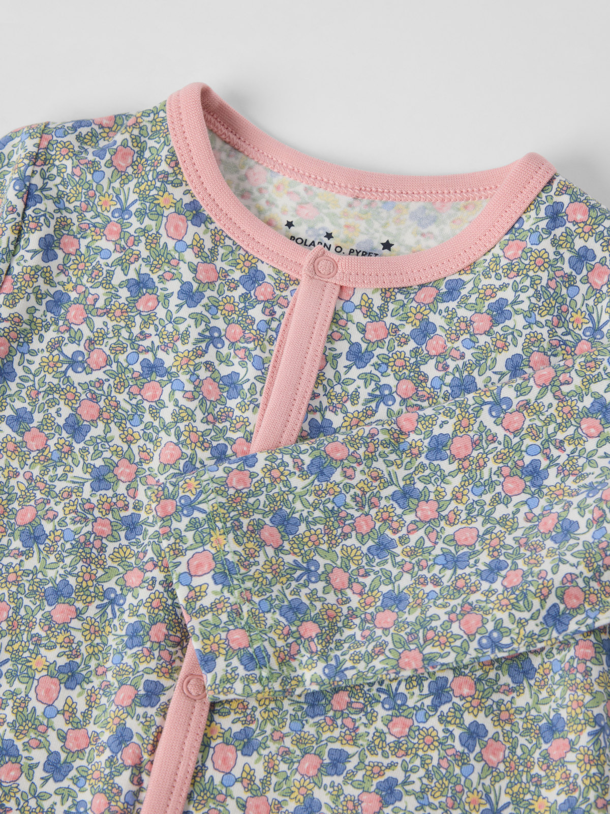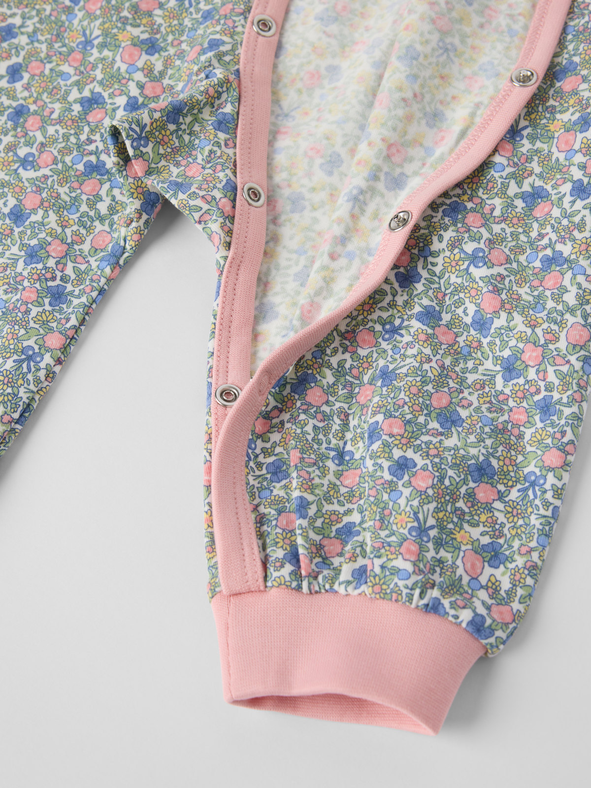 Pyjamasoverall i mjuk ekologisk bomull, helmönstrad med blommor. Overallen är sydd med extra mjuka, platta sömmar som är skonsamma mot känslig hud. Muddar i benslut ger skön passform. Tryckknapparna från hals till benslut förenklar klädbyten.