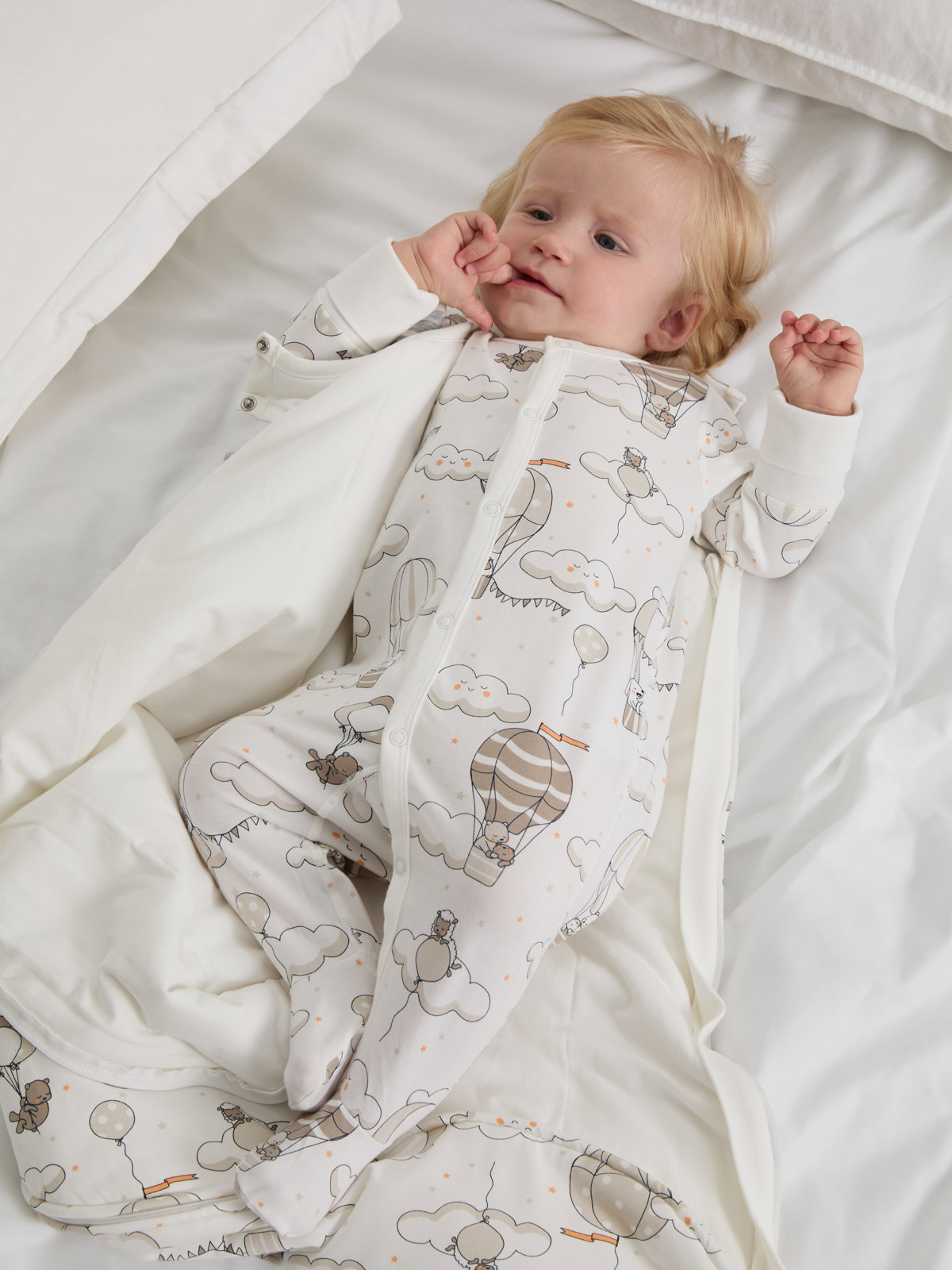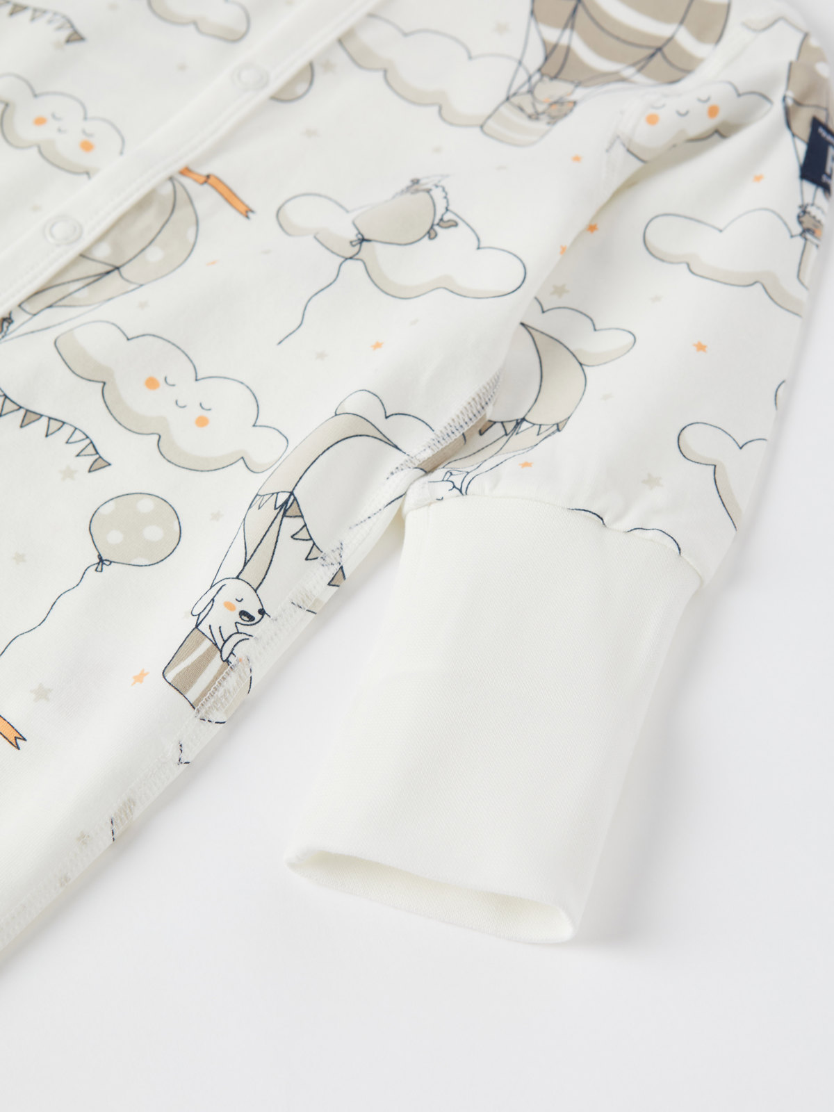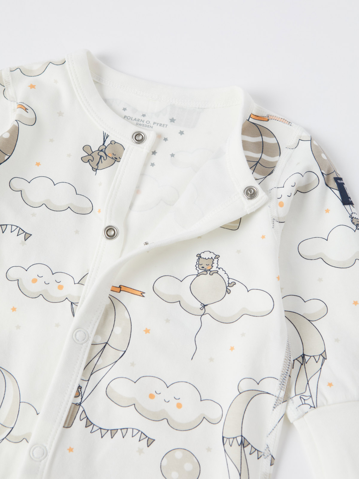 Pyjamasoverall i mjuk ekologisk bomull gjord för de allra minsta. Pyjamasoverallen och har ett fint tryck med luftballonger.