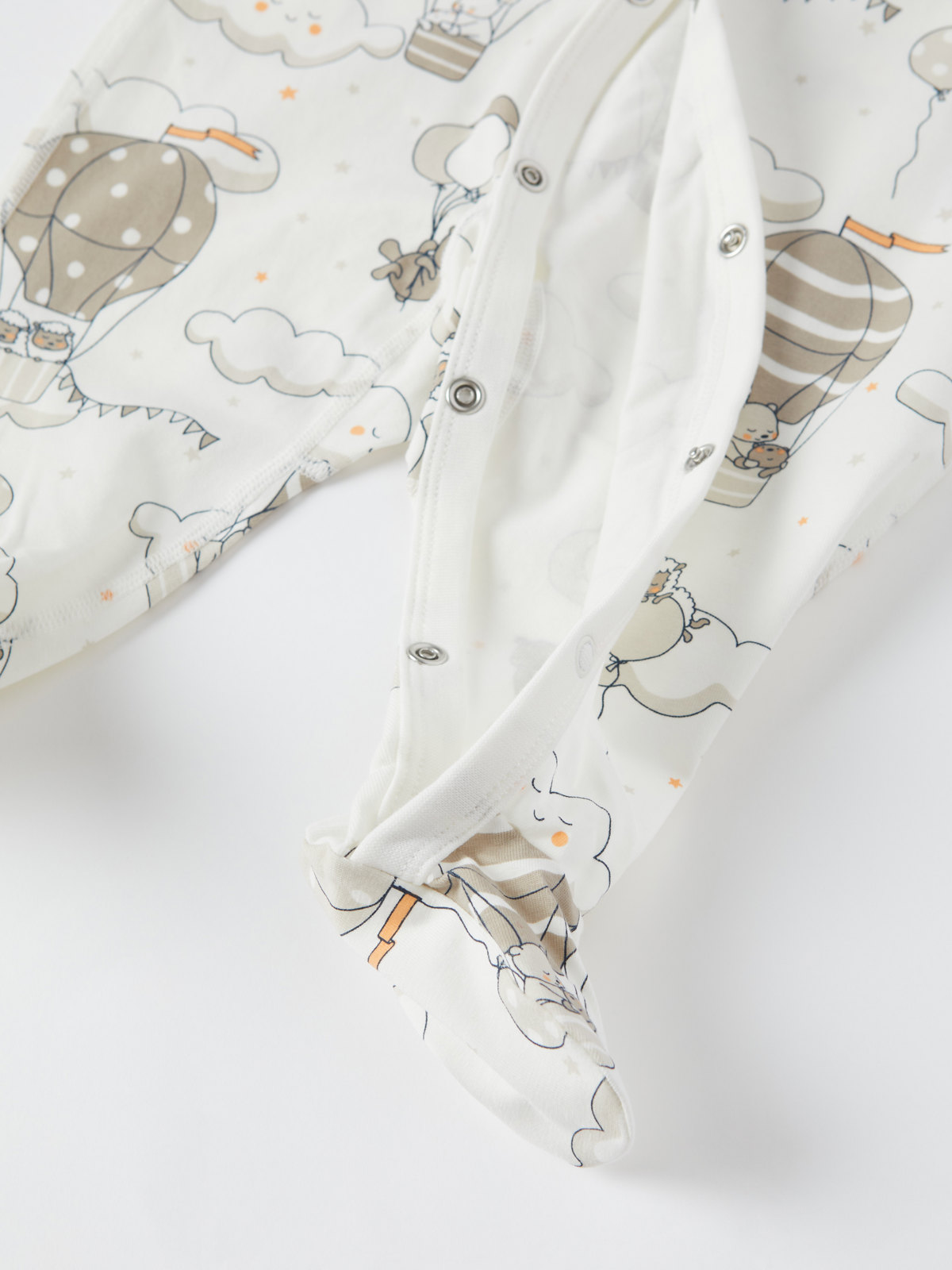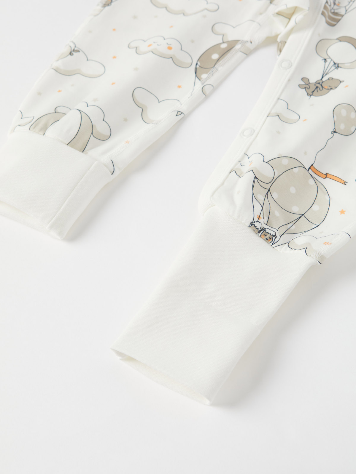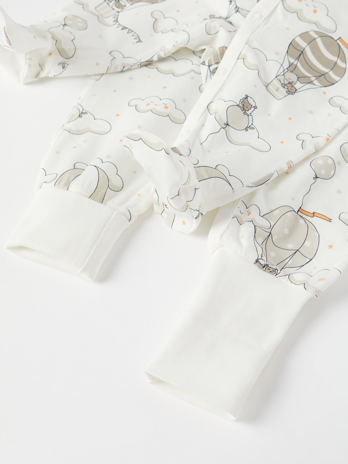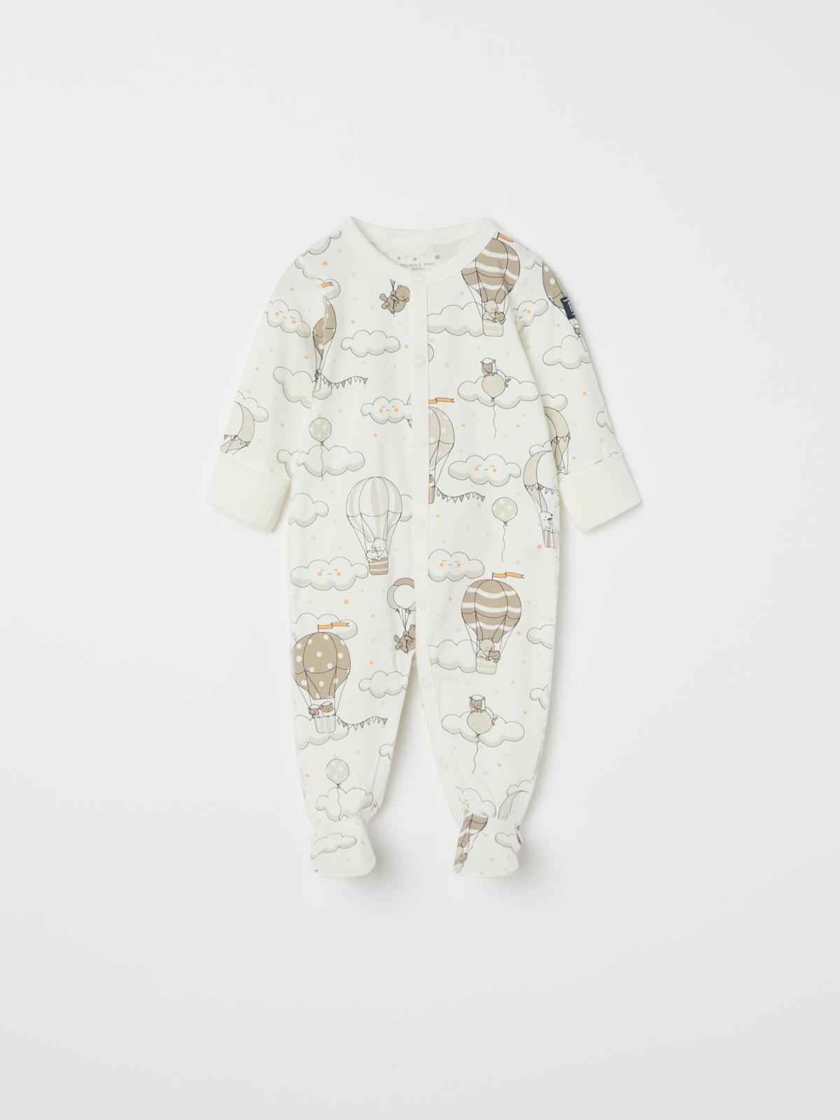 Pyjamasoverall i mjuk ekologisk bomull gjord för de allra minsta. Pyjamasoverallen och har ett fint tryck med luftballonger.
