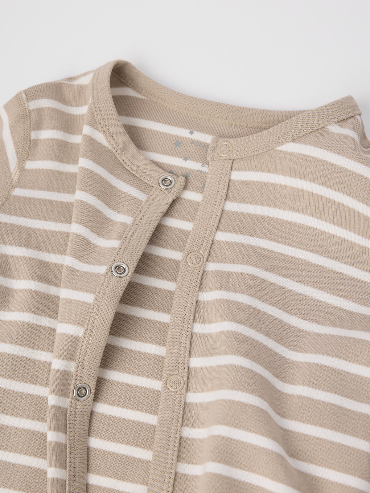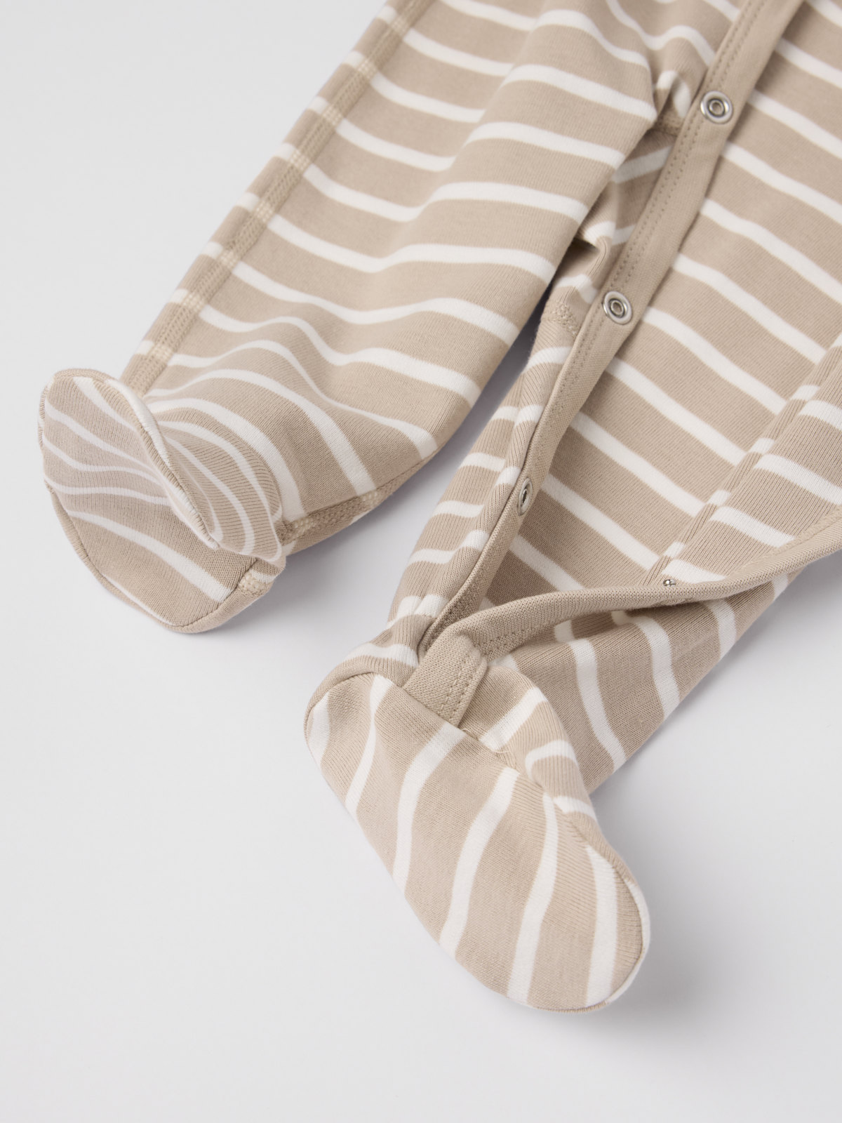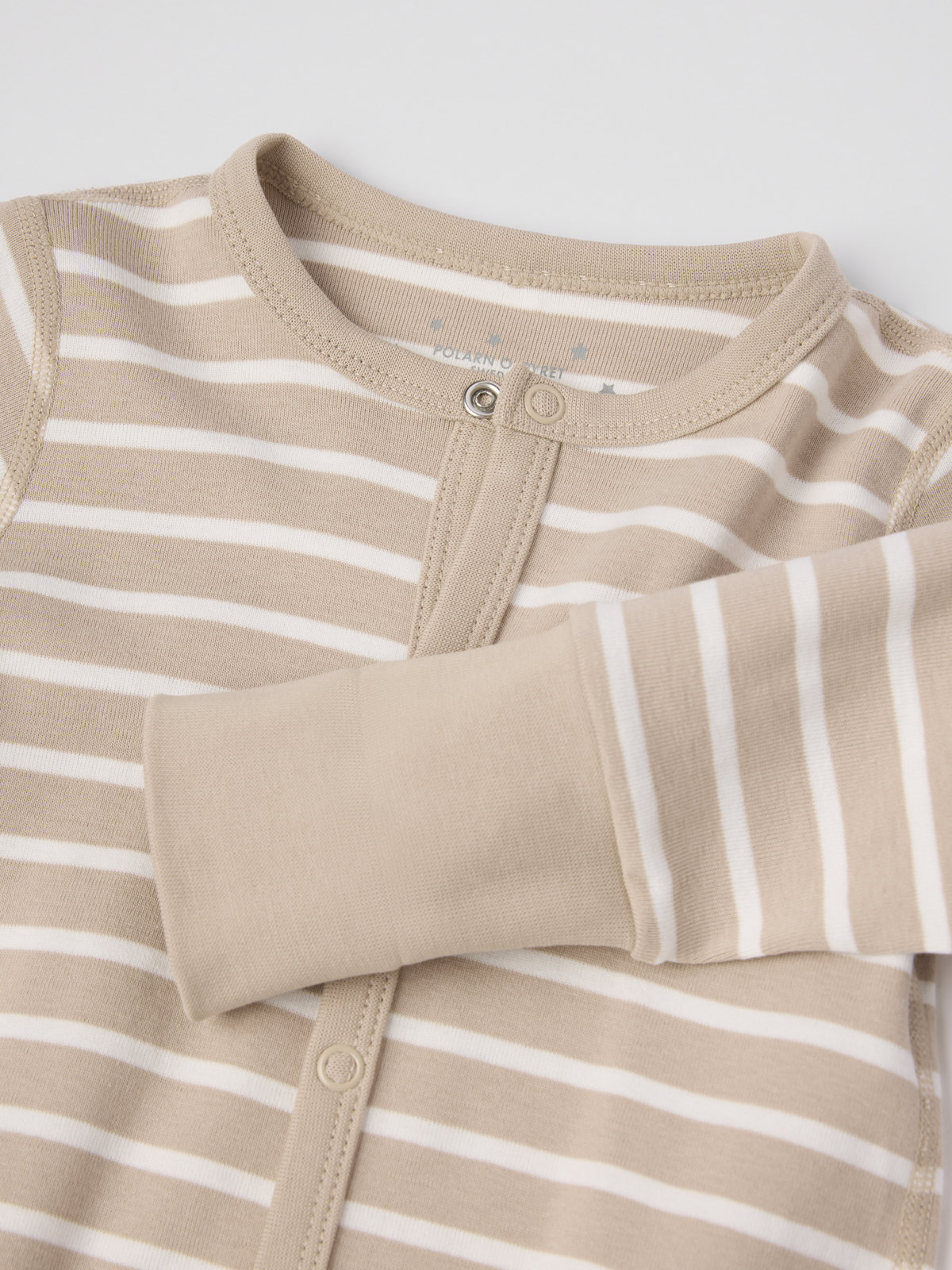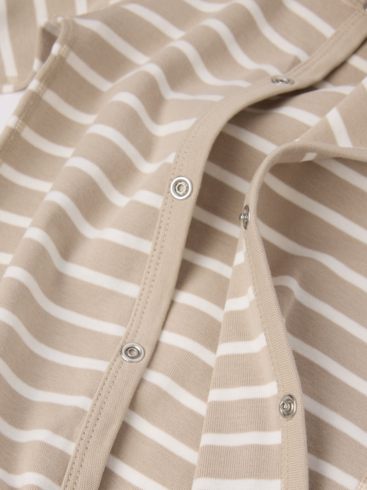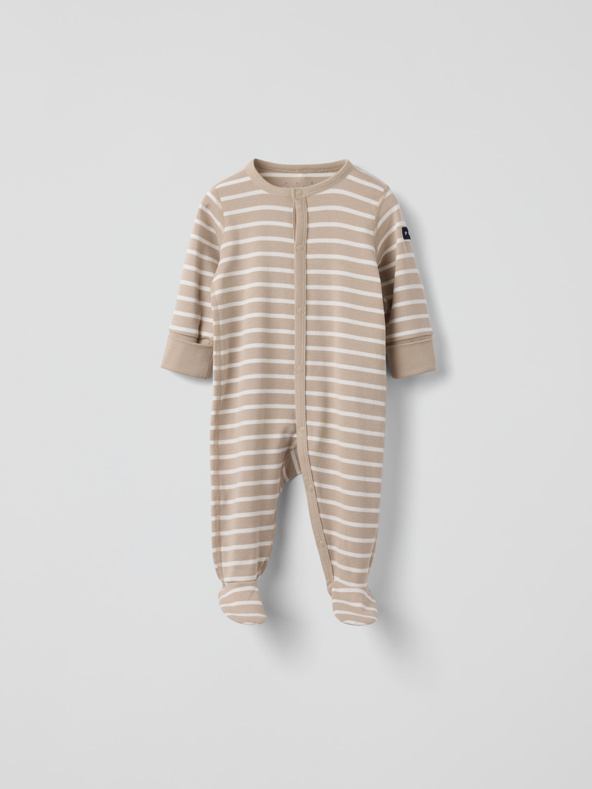 Randig pyjamasoverall i mjuk ekologisk bomull gjord för de allra minsta. Muddarna vid ärm- och benslut är extra långa och går att vika ned allteftersom barnet växer. Knapparna från hals till benslut underlättar klädbyten. Storlek 50-68 har påsydda fötter med mjuk resår runt ankeln för skön passform.