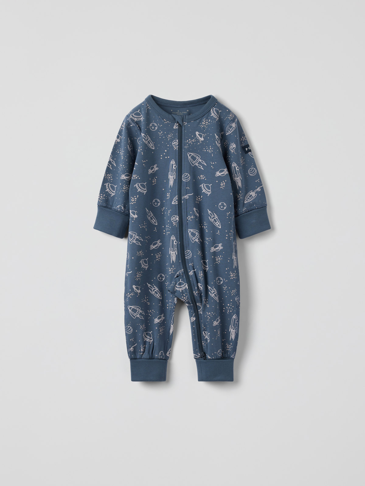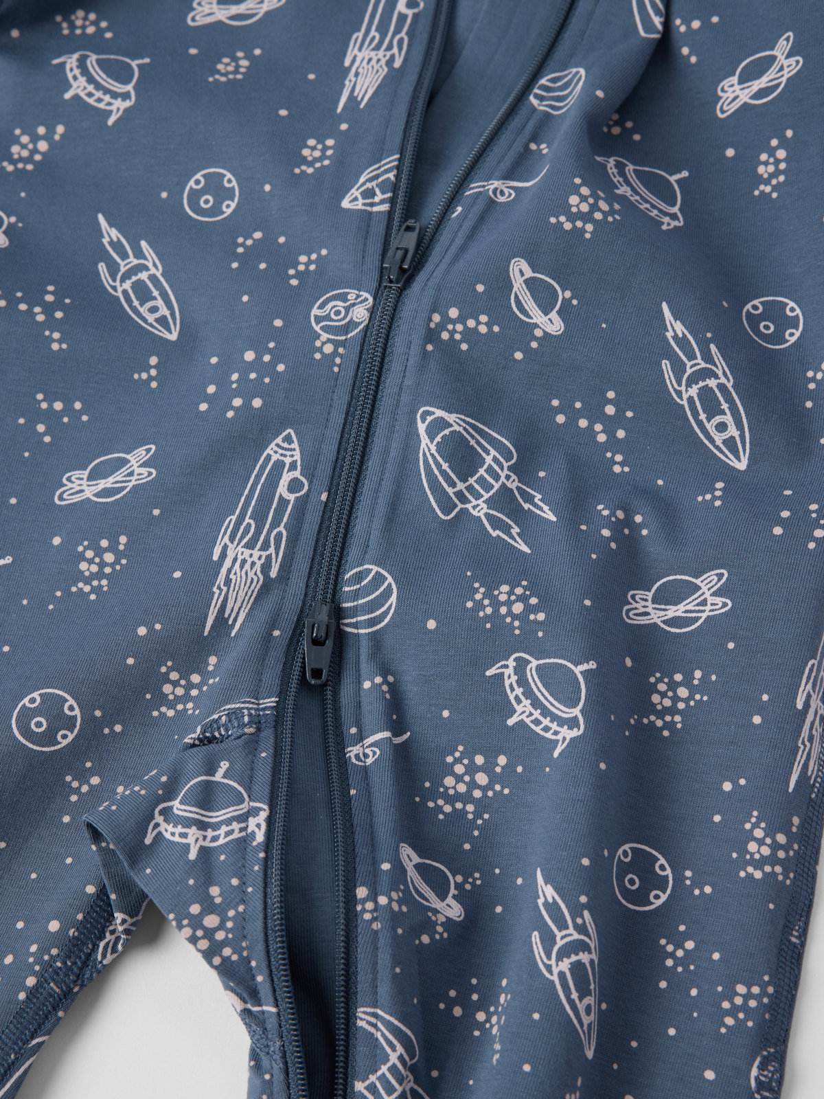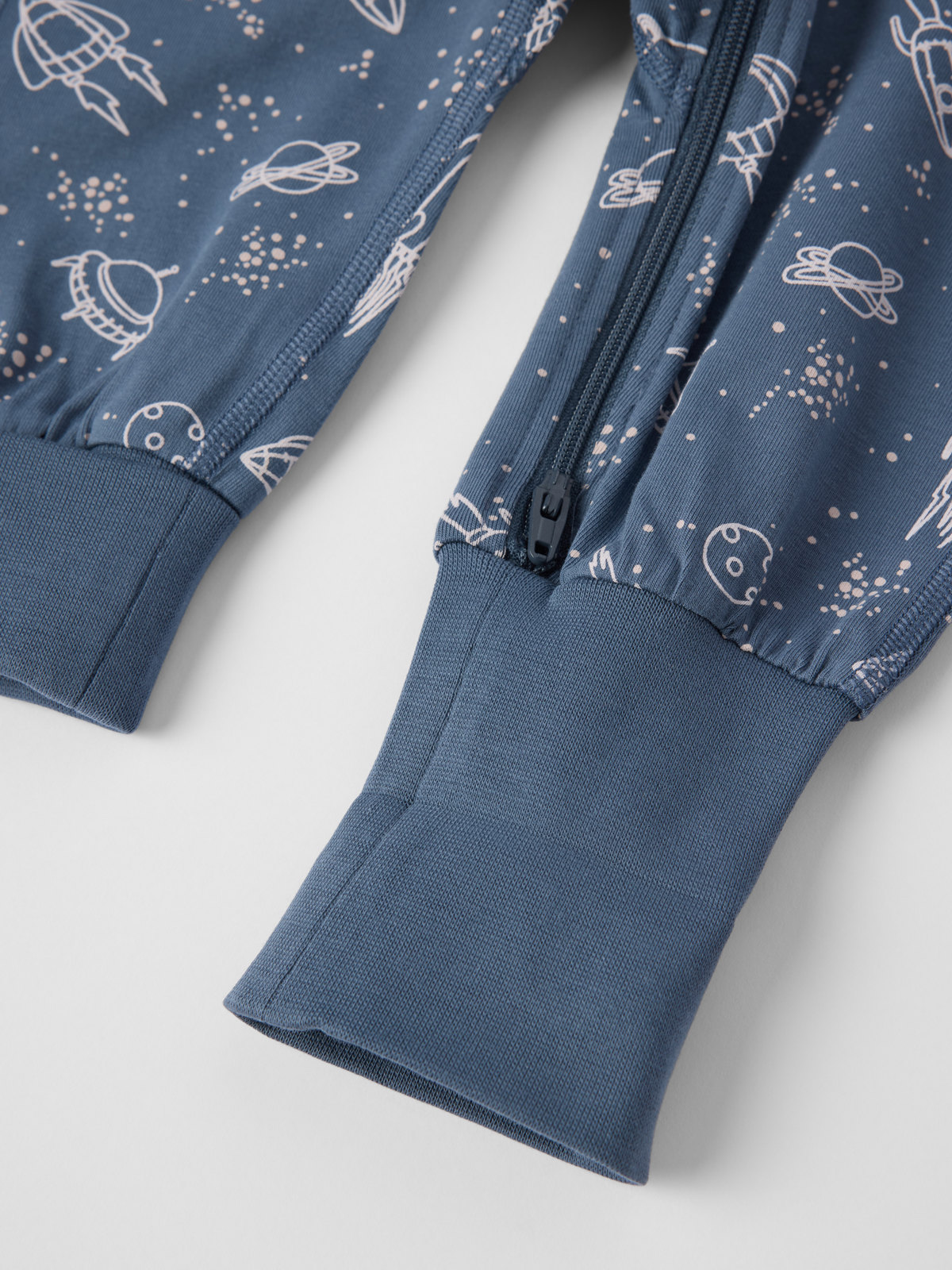 Pyjamasoverall i mjuk ekologisk bomull, sydd med extra mjuka, platta sömmar som är skonsamma mot känslig hud. Muddarna vid ärm- och benslut är extra långa och går att vika ned allteftersom barnet växer. Den långa dragkedjan från hals till benslut är öppningsbar både uppifrån och nedifrån för att underlätta klädbyten.