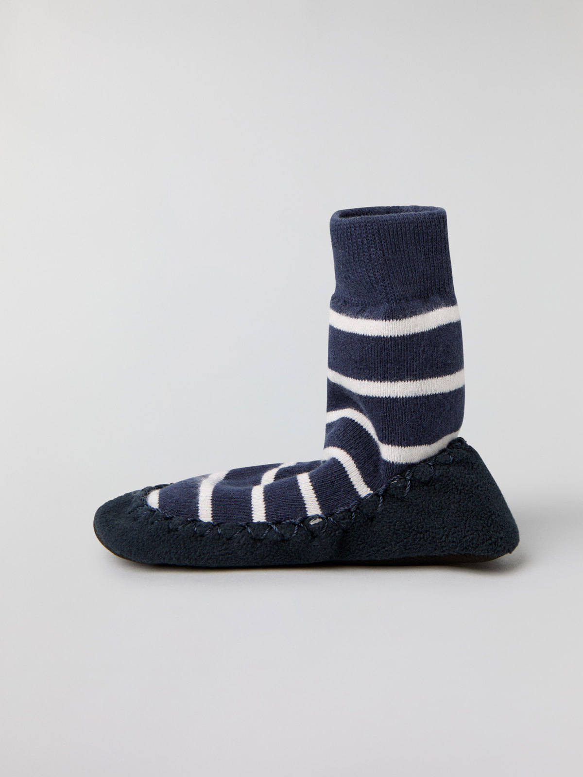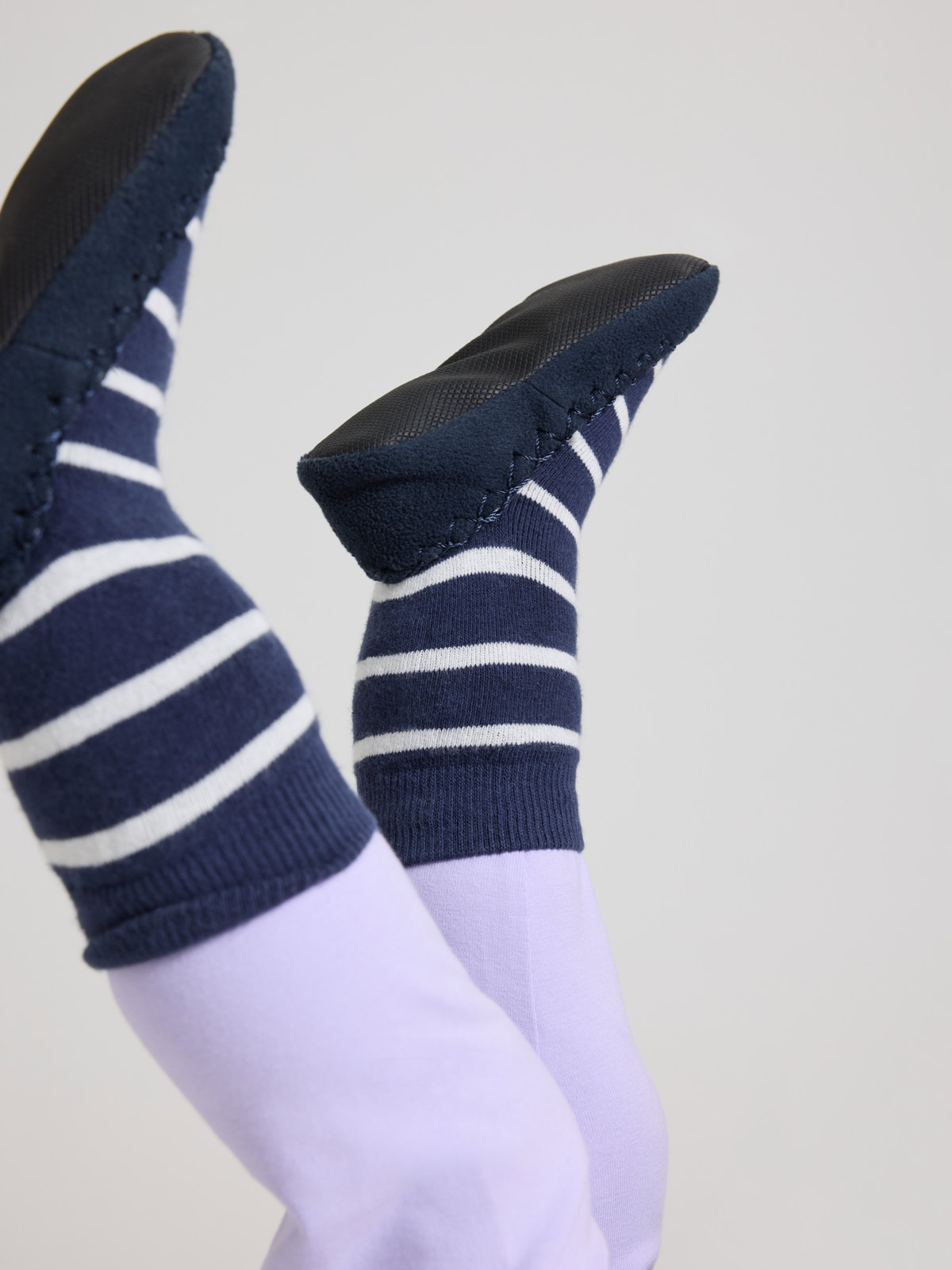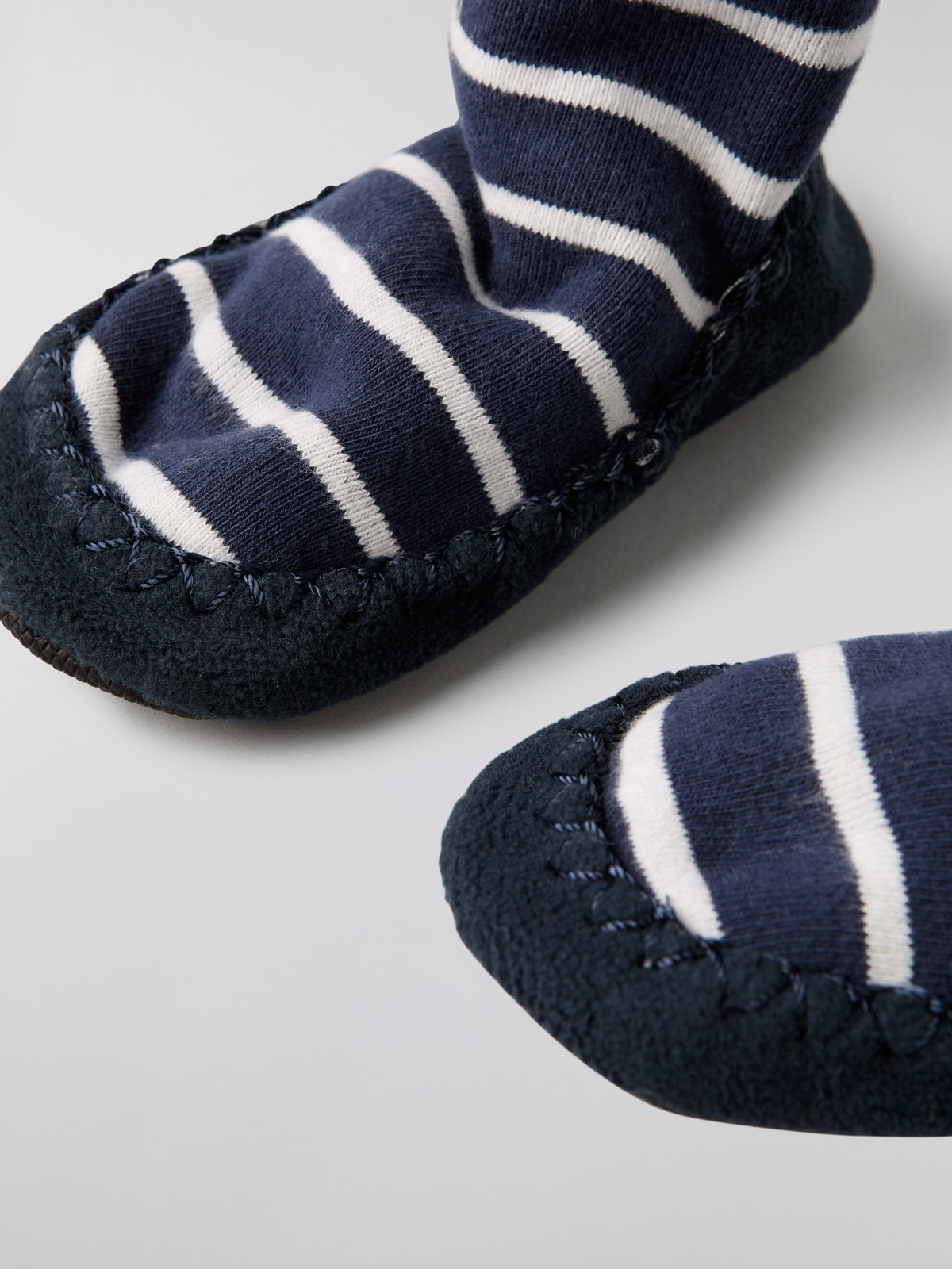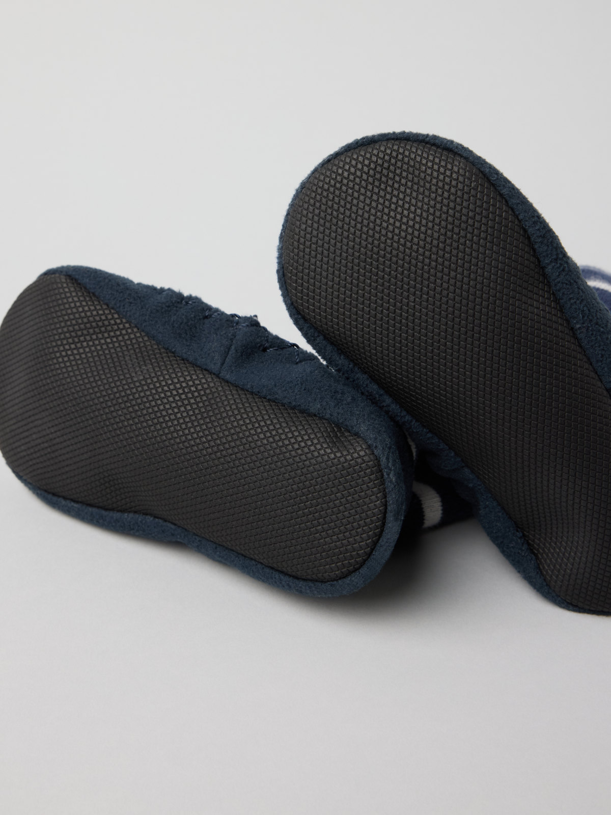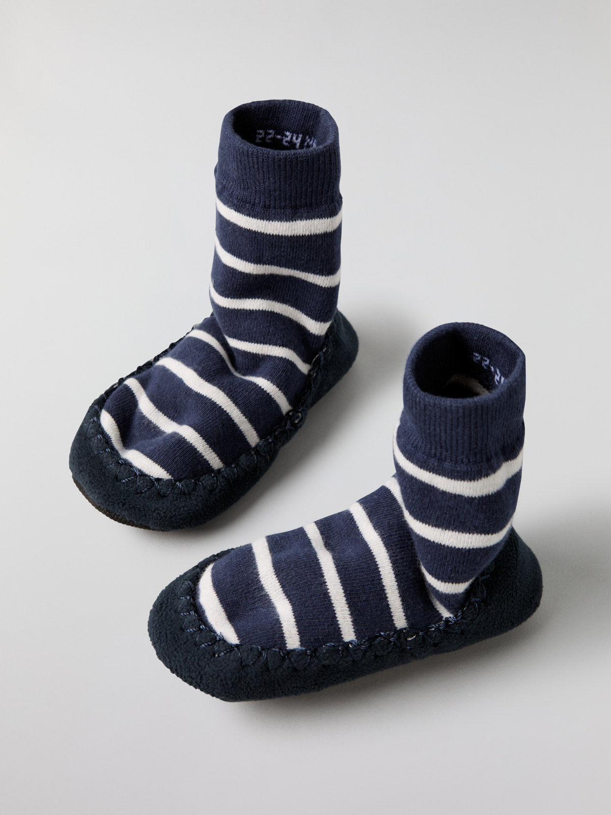 Mockasinerna har en sula i smart skalmaterial med extra greppvänlig yta och mjuk fleecekant. Ovansidan är i stickad trikå som ger skön passform och gör dem enkla att ta på och av.