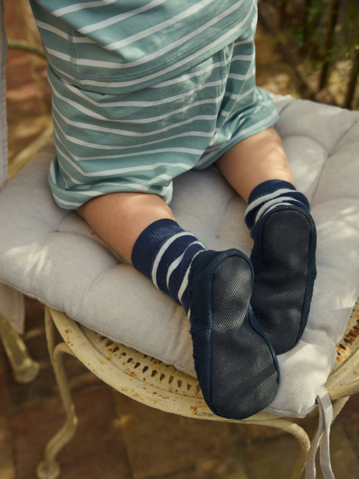 Våra klassiska mockasiner är äntligen tillbaka i sortimentet – med ny, greppvänlig sula. En mjuk och skön innesko som passar perfekt på förskolan!