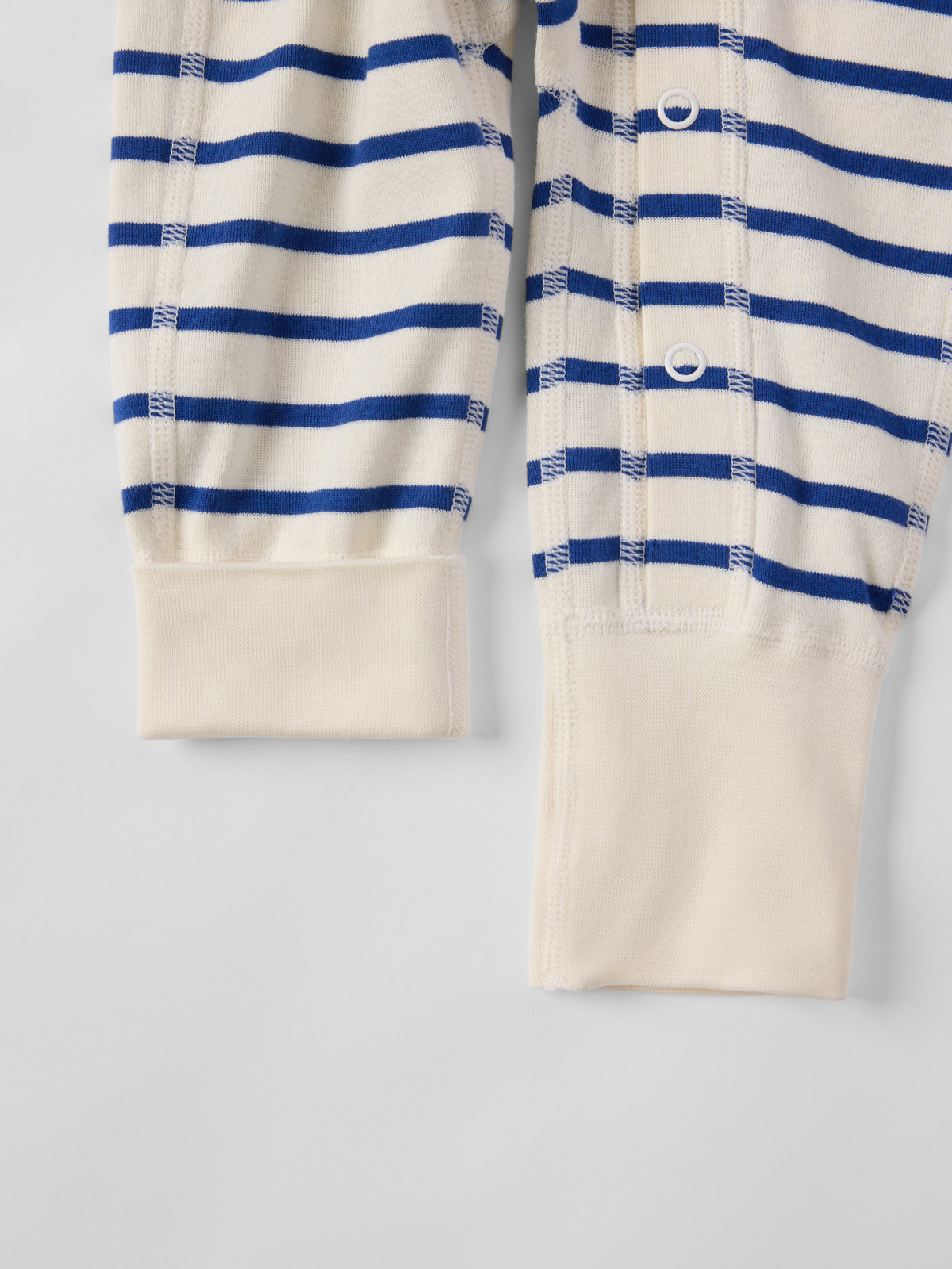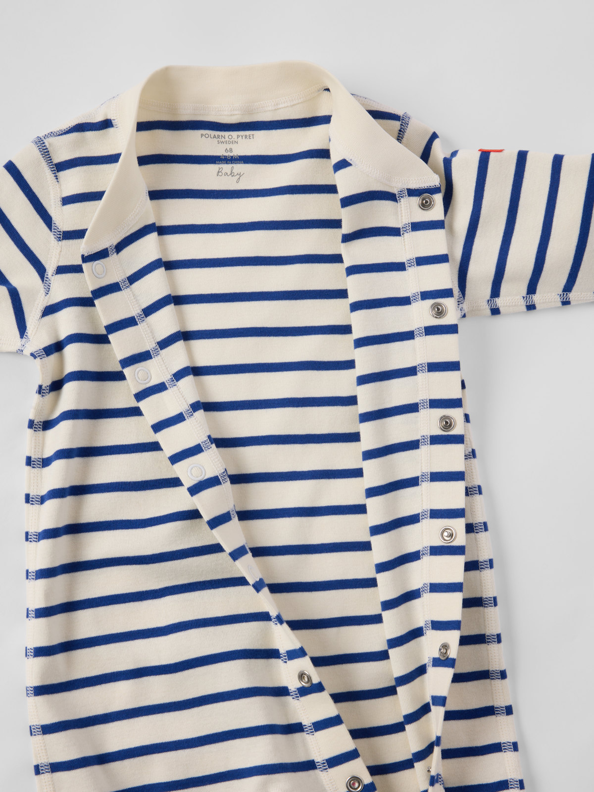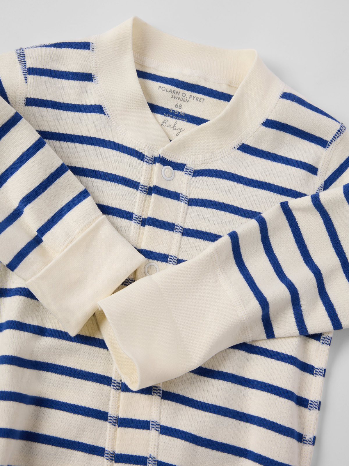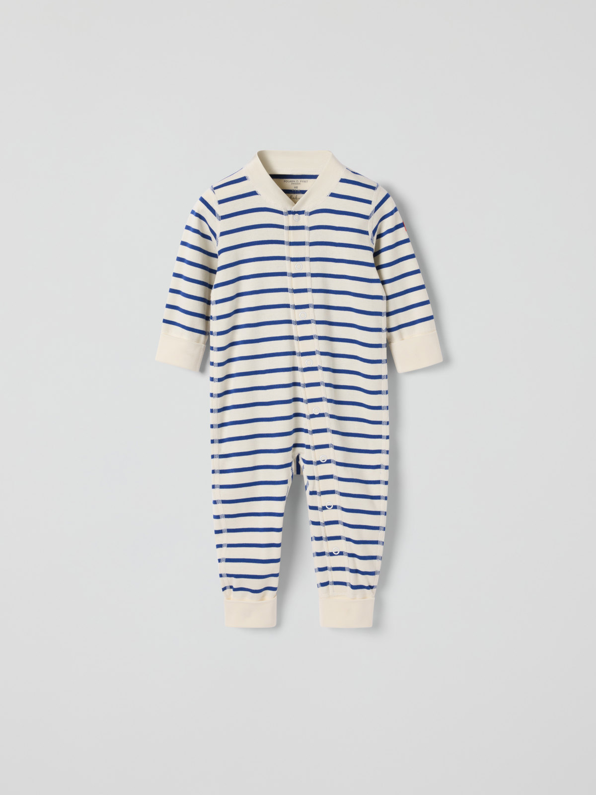 Vår klassiska randiga overall i mjuk ekologisk bomull – perfekt som både pyjamas och mysplagg! Overallen är sydd med extra mjuka, platta sömmar som är skonsamma mot känslig hud. Muddarna vid ärm- och benslut är extra långa och går att vika ned allteftersom barnet växer. Den långa knappslån från hals till benslut underlättar klädbyten.