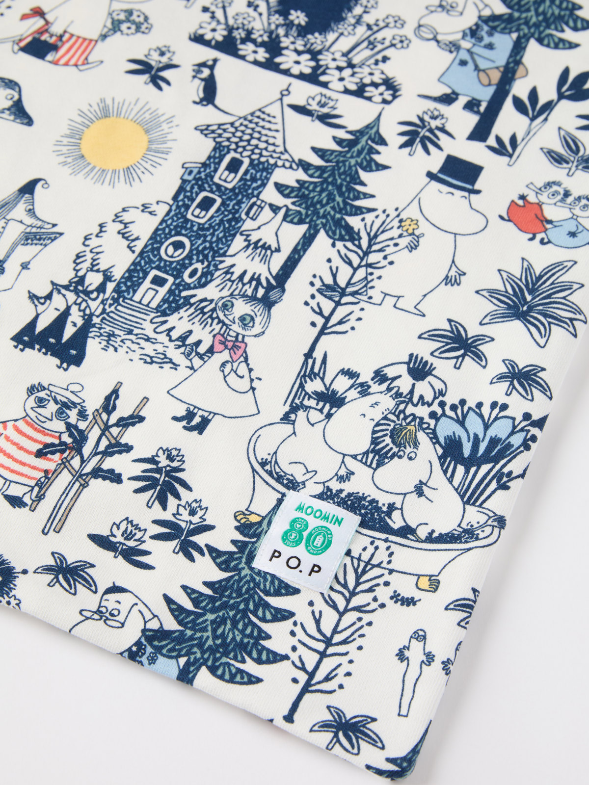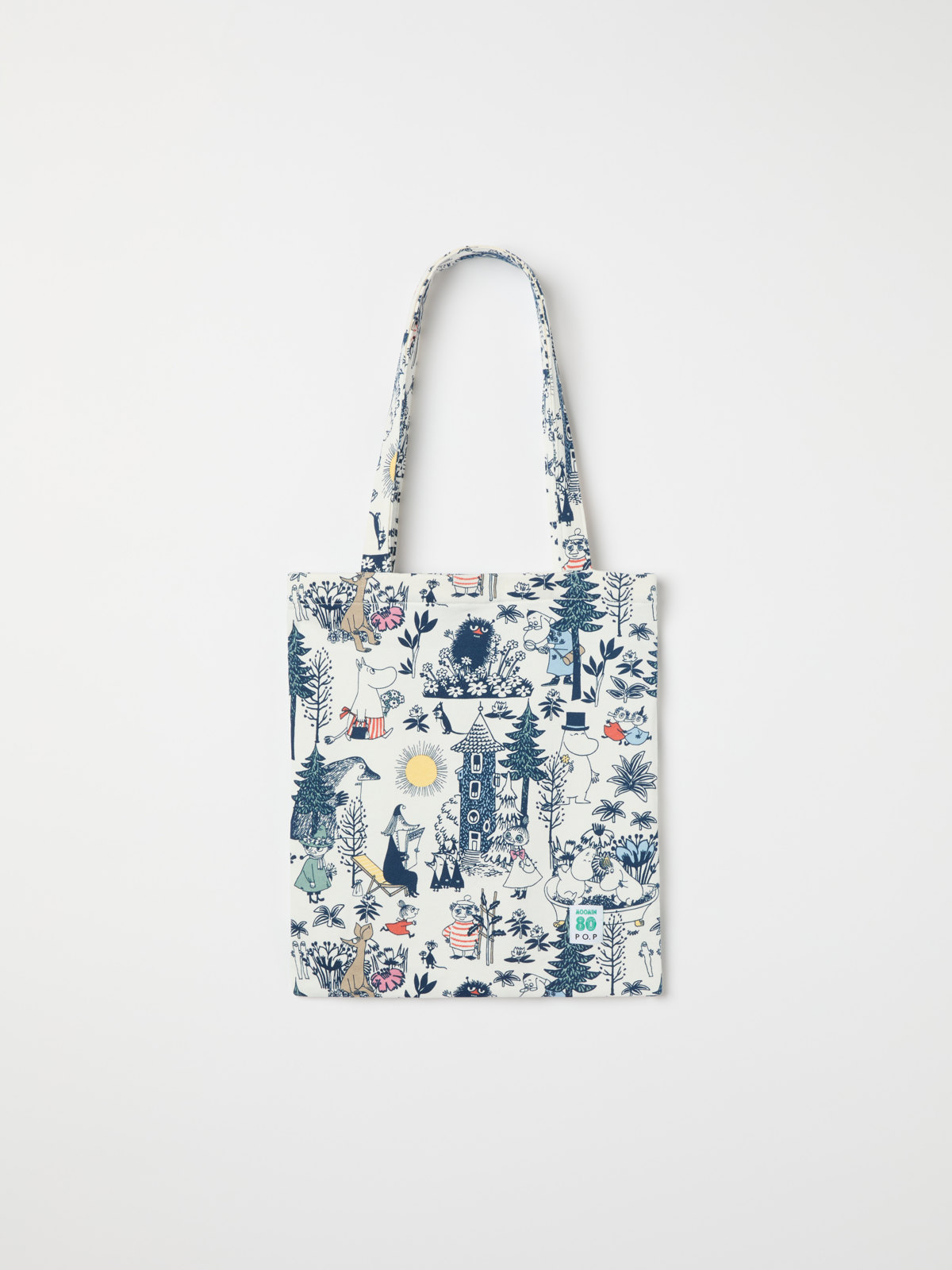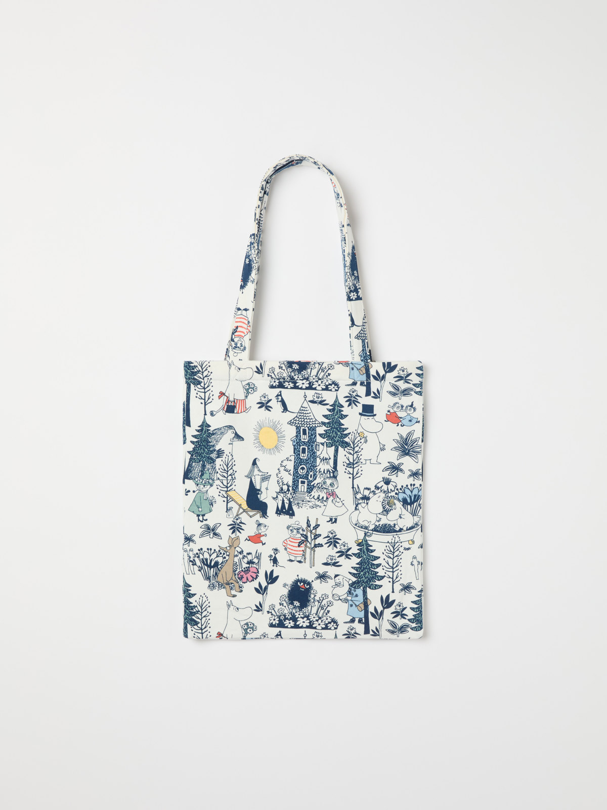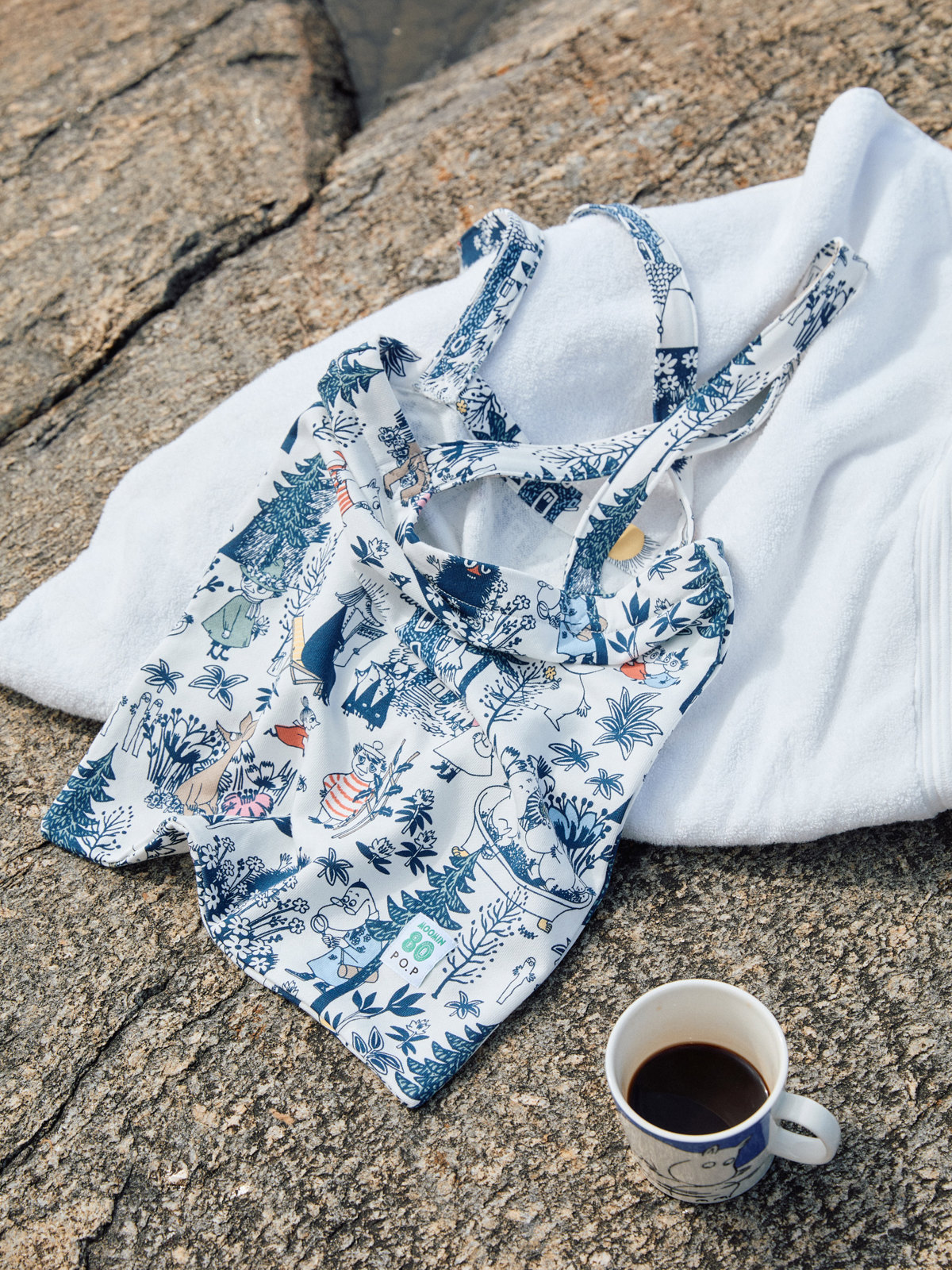 Tygpåsen är helmönstrad med illustrationer från Tove Janssons berättelser om mumintrollen.