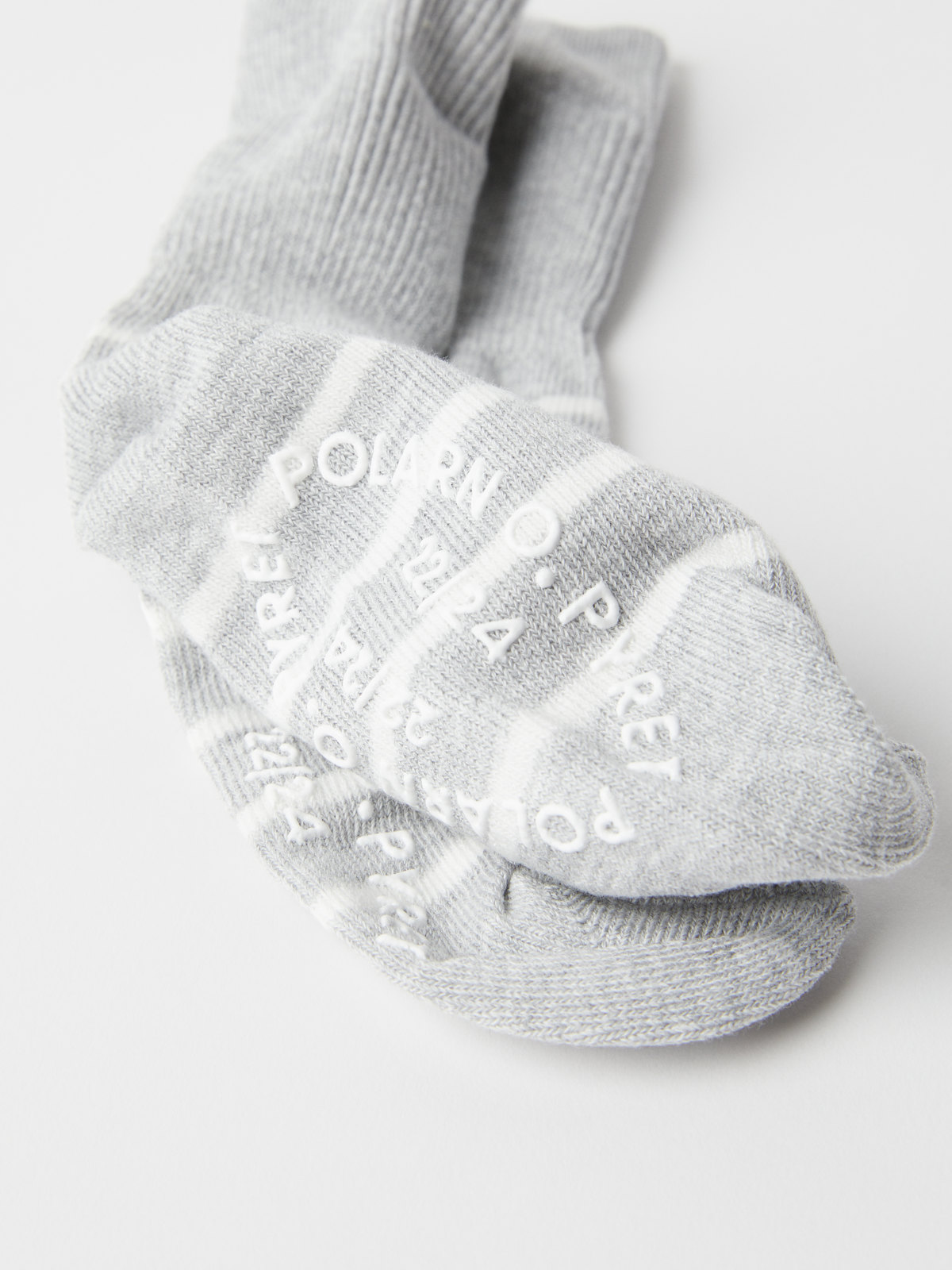 Tvåpack strumpor med halkskydd. Strumporna är tillverkade i mjuk ekologisk bomull och har vår klassiska rand. Mudden kan vikas upp eller ned. Den här produkten ingår i vårt 3 för 2-erbjudande, som ej kan kombineras med andra erbjudanden.