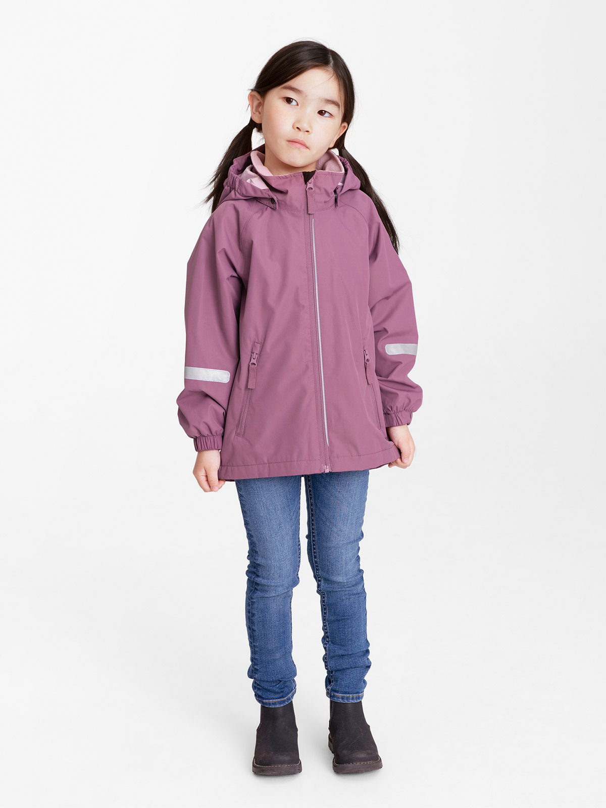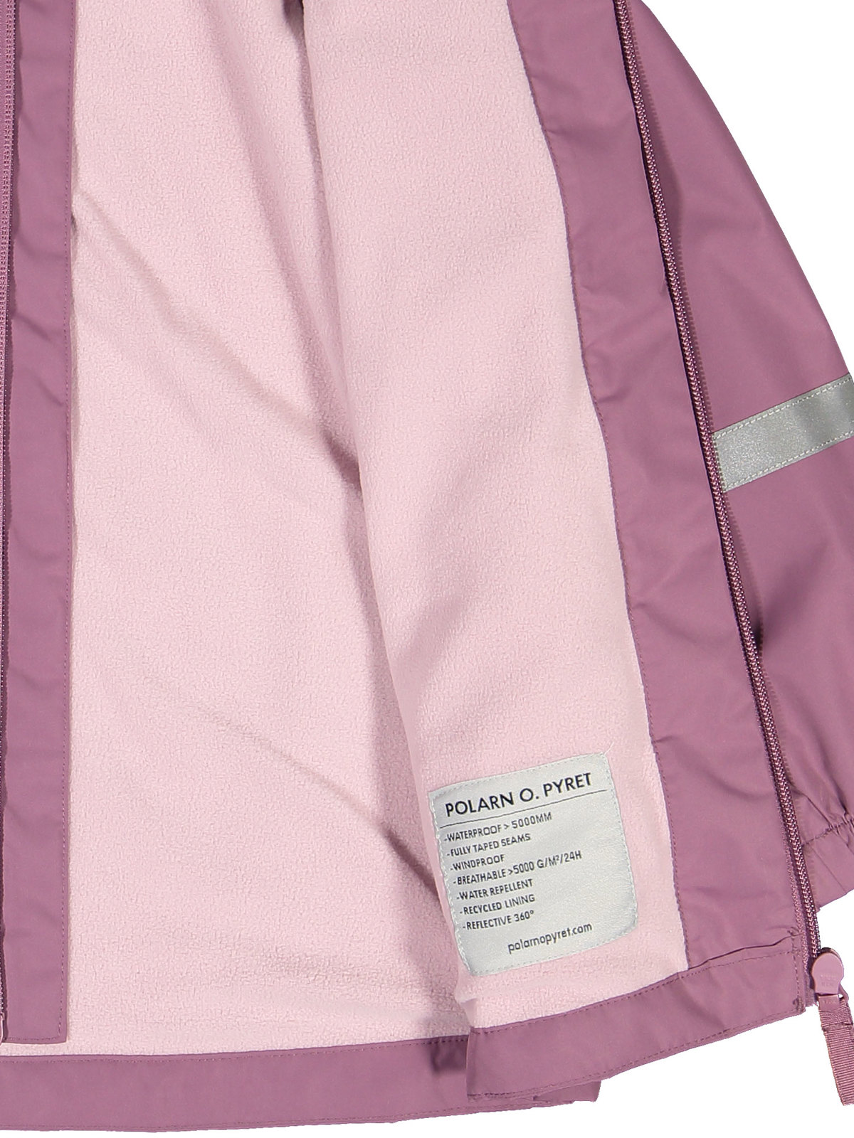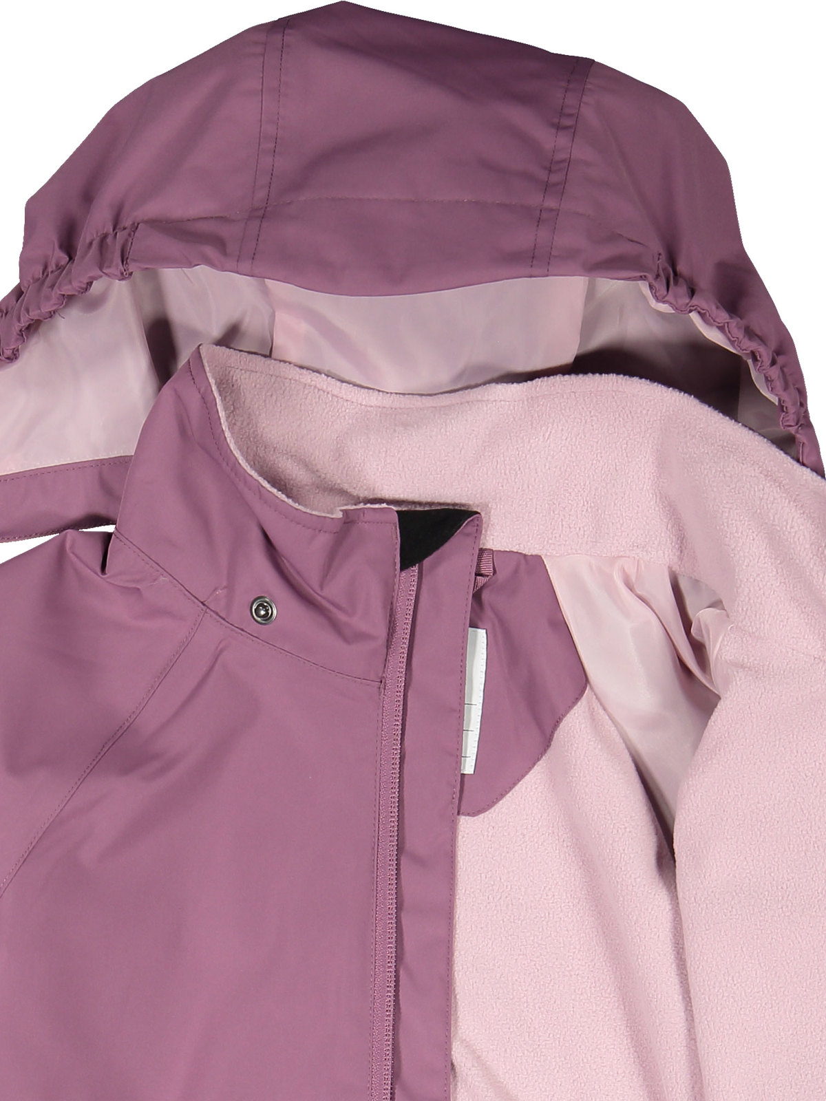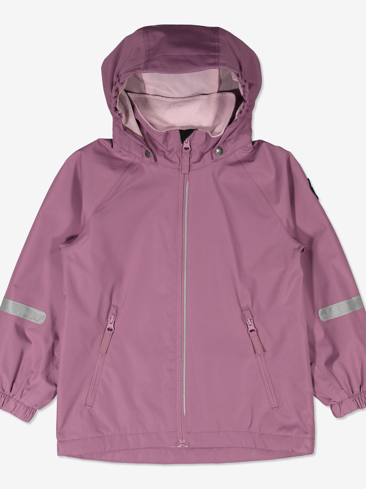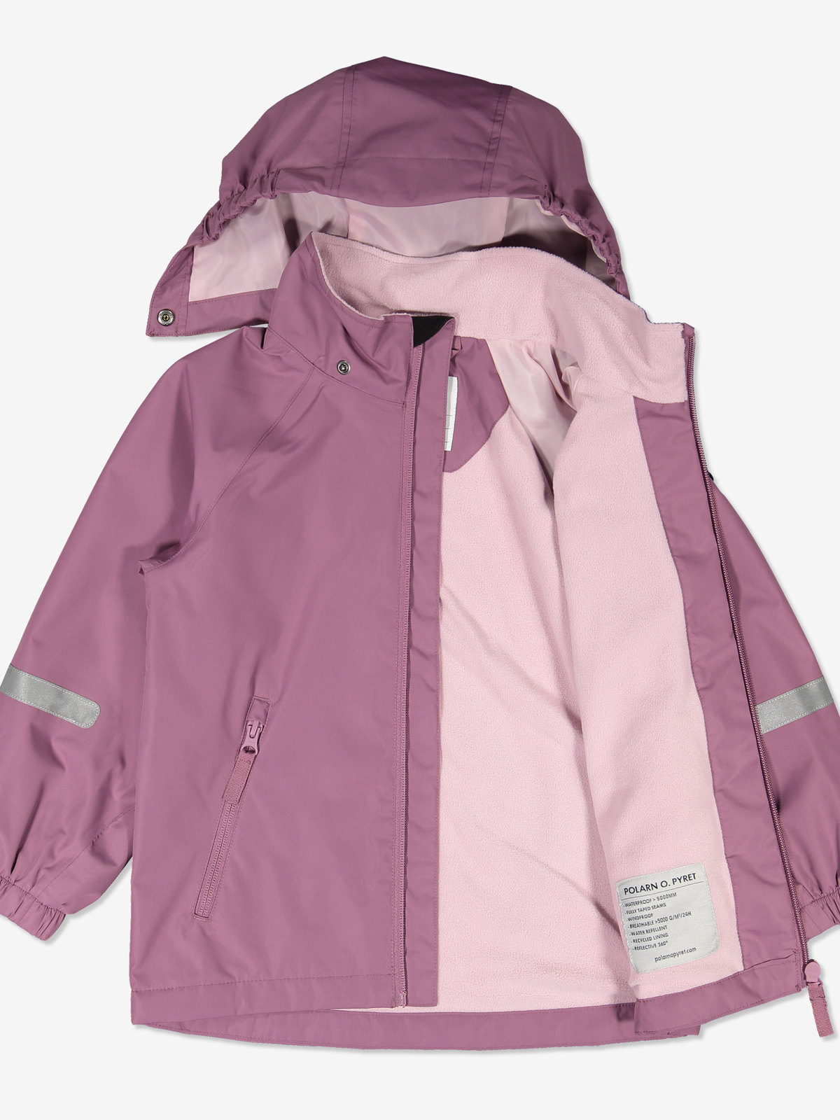 Jackan är av slitstarkt material och har dessutom god andningsförmåga. Den har ett enfärgat fleecefoder i 100% återvunnen polyester, och avtagbar huva som går att fästas med tryckknappar, huvan har dessutom elastik i sidorna. Jackan har elastiska ärmslut och heltejpade sömmar som gör den helt vattentät. Vindslån på insidan av dragkedjan ger extra skydd mot kall luft. Den har även ett mjukt fleecefoder på dess övre del. Jackan tillverkas i två utföranden, välj mellan en enfärgad eller en djurmönstrad.