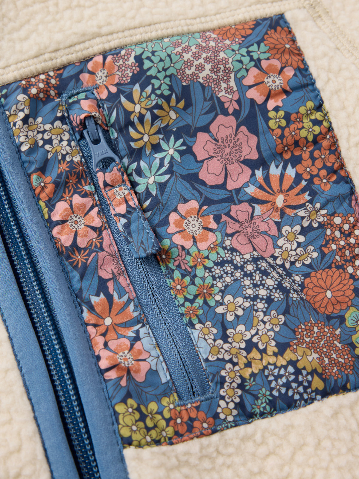 Mjuk och skön pilefleecejacka i återvunnen polyester – en del av vårt exklusiva designsamarbete med Liberty Fabrics. Ett perfekt plagg som håller ditt barn varmt under höst och vår. Jackan har en vindslå på insidan av dragkedjan som ger extra skydd mot kall luft. Bröstfickan är prydd med ett av Libery Fabrics ikoniska blomprints. Fleecejackan kommer i en begränsad upplaga.