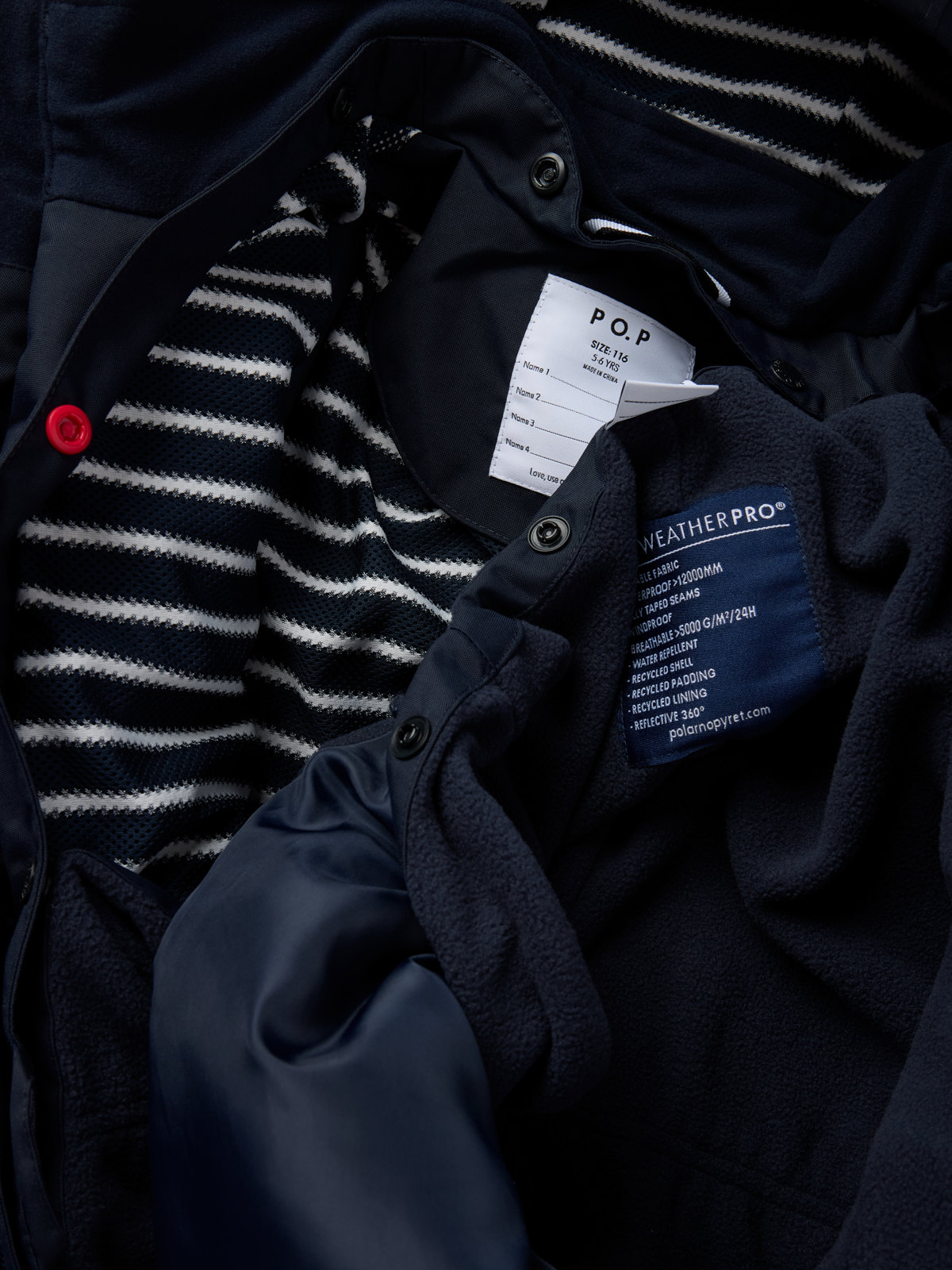 Ytterkläder märkta PO.P WeatherPro® uppfyller alla våra krav för funktionsytterplagg, oavsett om det gäller slitstyrka, vattentäthet, andningsförmåga eller barnsäkerhet.