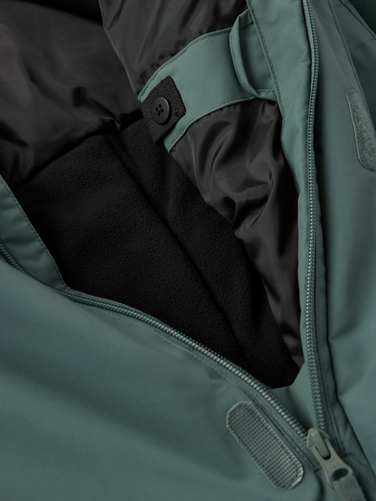 • Dragkedjan har ett skydd högst upp för att inte skava mot haka och kind, och täcks av en dubbel vindslå som ytterligare skyddar från kyla och snö