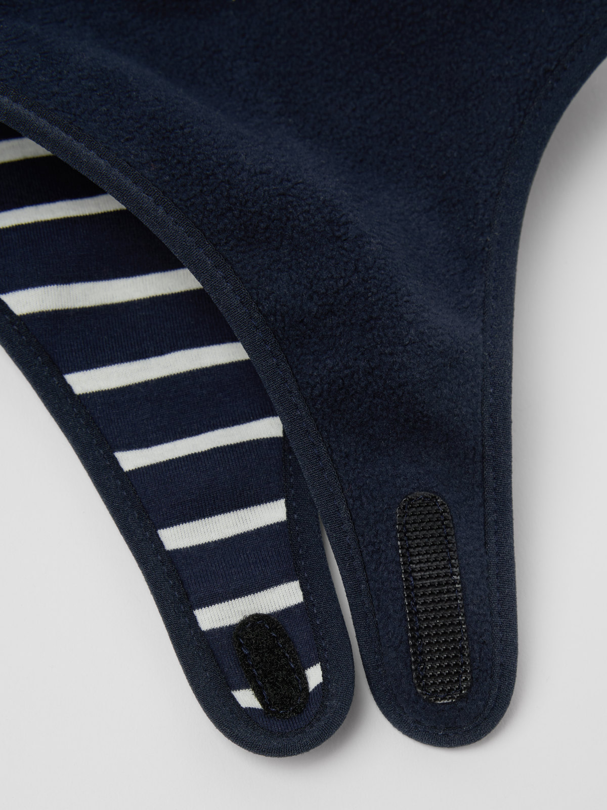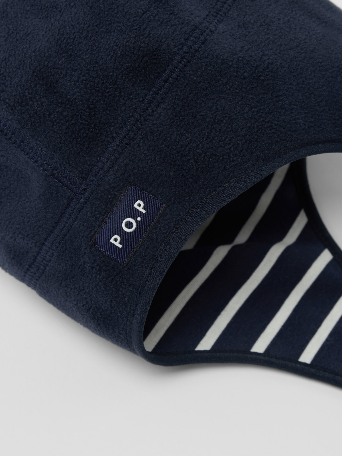 Vindtät och vattenavvisande hjälmmössa i mjuk fleece för baby. Mössan är tillverkad i återvunnen polyester och insidan är fodrad med mjuk ekologisk bomullstrikå med vår klassiska rand. Mössan stängs med kardborreband under hakan.